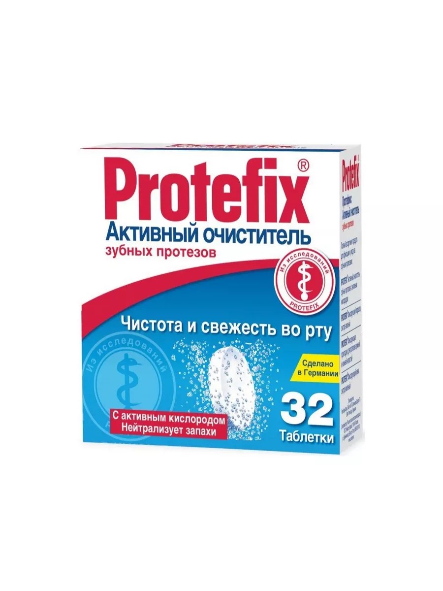 Protefix активный очиститель зубных протезов, в удобном формате таблеток, предназначен для быстрой и эффективной очистки поверхности протезов. Одной только чистки протезов зубной щеткой недостаточно, необходимы специальные средства для ежедневного ухода за зубными протезами. Особенно хорошо в качестве таких средств зарекомендовали себя таблетки. Они содержат активный кислород, очищают протезы, уничтожают запахи, не разрушая при этом ценный материал, из которого изготовлены протезы, надолго сохраняют свежий запах во рту. Удобная упаковка в виде таблеток позволяет легко брать с собой в дорогу или на работу, а также дозировать необходимое количество средства для очистки протезов. Сделайте уход за своими зубными протезами еще проще и удобнее с Protefix активным очистителем.