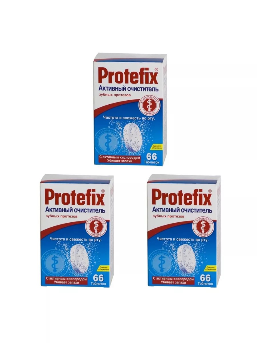 В течение дня в полости рта скапливаются остатки пищи, что обуславливает необходимость тщательной гигиены полости рта. Зубные протезы отрицательно влияют на состояние микрофлоры полости рта и нарушают процесс естественного самоочищения. Все это вызывает воспалительные процессы, образование налета и, как результат, неприятный запах во рту. Именно поэтому, одной только чистки протезов зубной щеткой недостаточно, необходимы специальные средства для ежедневного ухода за зубными протезами. Особенно хорошо в качестве таких средств зарекомендовали себя таблетки Protefix. Они содержат активный кислород, очищают протезы, уничтожают запахи, не разрушая при этом ценный материал, из которого изготовлены протезы, надолго сохраняют свежий запах во рту.