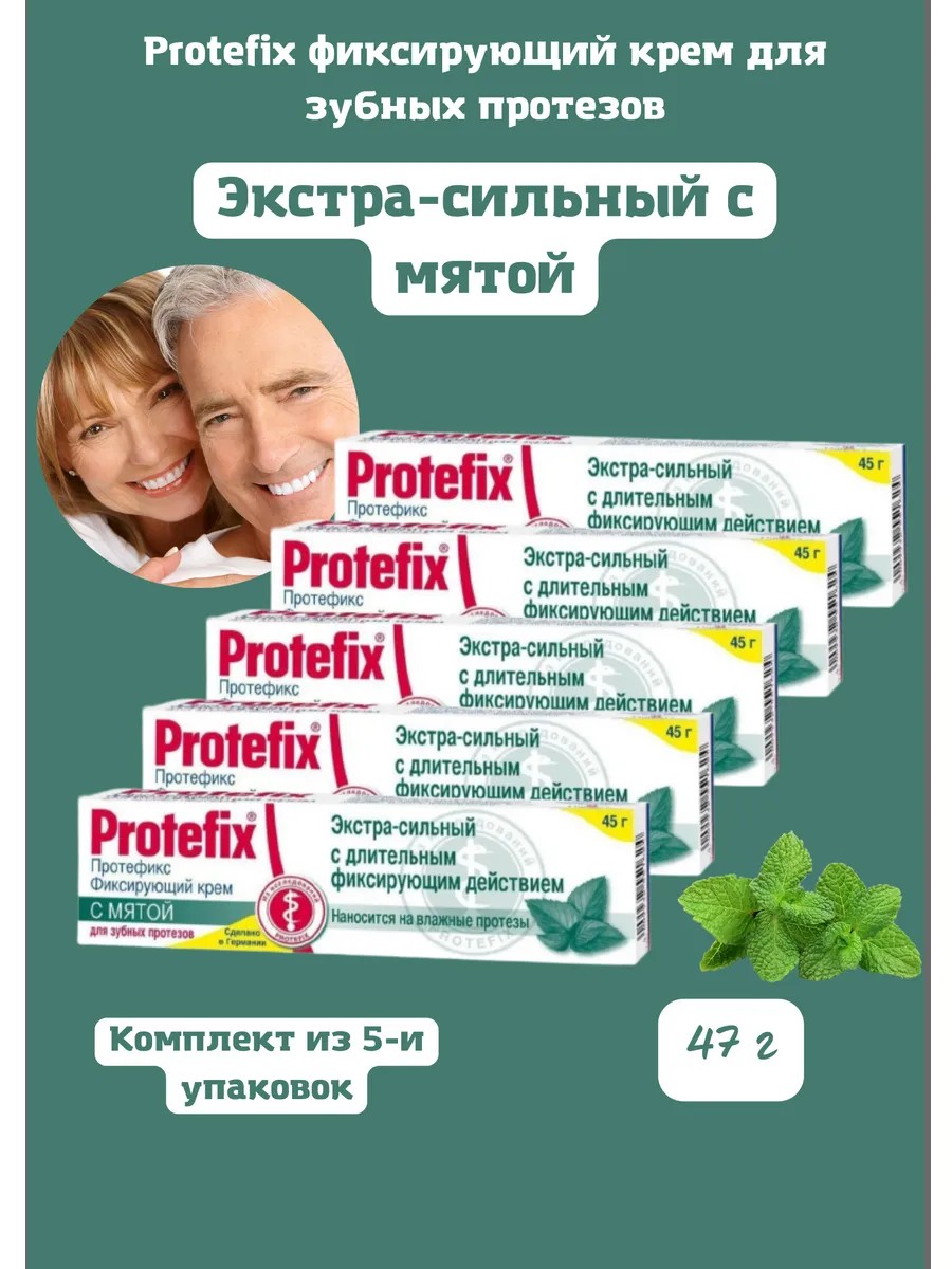 Средство гигиены полости рта крем для фиксации зубных протезов экстра-сильный. Способ применения: Протезы и полость рта очистить от остатков пищи. На влажные протезы нанести тонкой прерывистой линией фиксирующий крем Протефикс с мятой (Protefix) (в углубления на зубных протезах верхней и/или нижней челюстей, которые затем ложатся на десны). При необходимости можно нанести полоску фиксирующего крема и на заднюю часть пластины протеза верхней челюсти. Затем вставить протез и на несколько секунд прижать его к деснам. Сильная фиксация возникает практически немедленно и продолжается на протяжении 8-12 часов. Применять только при здоровой слизистой оболочке полости рта! В течение 5 минут после нанесения не следует принимать пищу.