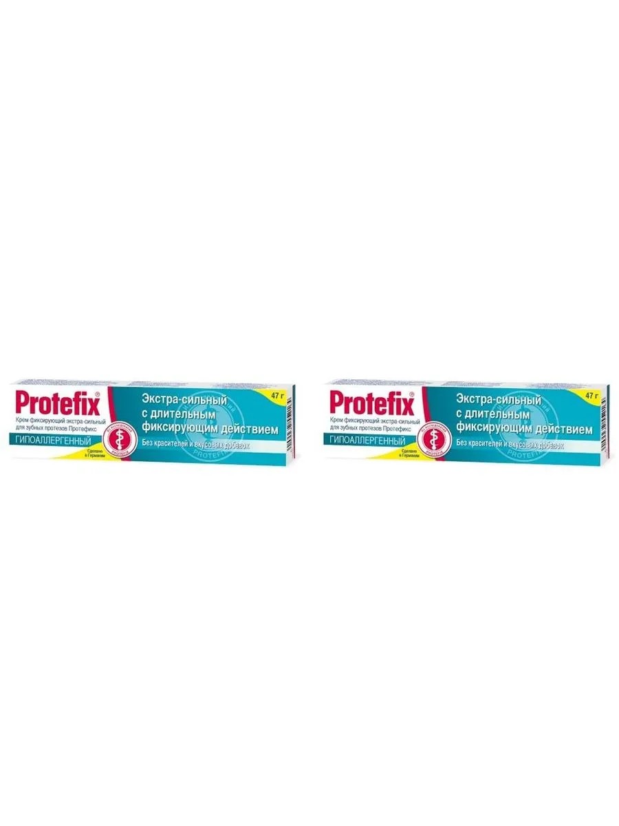 PROTEFIX CREAM FIXER EXTRA-STRONG HYPOALLERGEN 47.0. with a long-lasting fixing action; extra-strong with a long-lasting fixing action for dentures a mixture of sodium and calcium salts of a copolymer of methyl vinyl ether and maleic anhydride, sodium carboxymethyl cellulose, paraffin, petrolatum, silicon dioxide Protefix Fixing Cream for Dentures Protefix hypoallergenic extra-strongProtefix Fixing Cream (Protefix) Hypoallergenic is recommended for reliable fixation of dentures with increased and normal salivation. It is easy to apply, maintains its properties under the influence of hot and cold food, does not change the taste of food and drinks, does not have a negative effect on the stomach. It is not washed off by saliva and is evenly distributed over the entire surface adjacent to the gum. Applied to wet dentures; Special features: Does not contain dyes or flavors. Tasteless and odorless. Features: Does not contain dyes or flavors; Strong and long-lasting fixation of dentures (at least 12 hours); Recommended for increased salivation; Prevents food from getting under the denture; Does not affect the taste of food and drinks; Convenient and economical to use; Efficiency and safety confirmed by clinical trials. Attention! Please pay attention to the following instructions: • Hold the tube vertically, this makes it easier to use. • It is necessary to press on the tube in the lower third, then the cream is easier to dose. • Sometimes an oily liquid is released from the neck before use, which does not affect the fixing power of the cream at all. Please simply remove it from the denture.• After use, the tube must be carefully closed, the neck of the tube must remain dry and clean, as liquid penetration will cause the cream to harden.• The remains of the fixing cream can be easily removed with a cotton swab with vegetable oil.• Keep out of the reach of children!• Do not use after the expiration date!