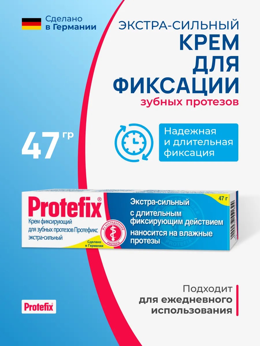 Крем Протефикс предназначен для длительной фиксации протезов – на 12 часов, рекомендуется людям с повышенным слюноотделением, предотвращает попадание пищи под протез.