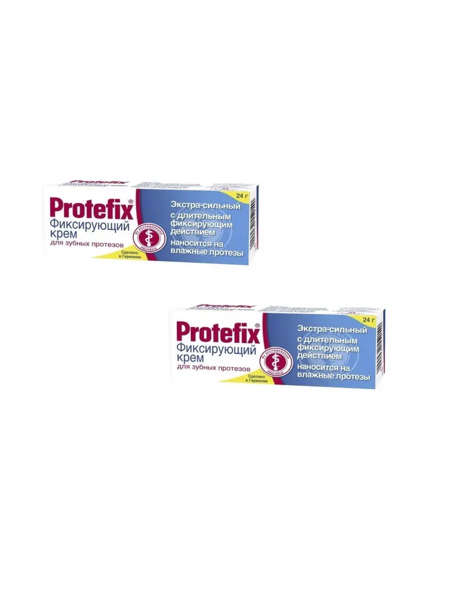 (Протефикс)Protefix Крем фиксирующий для зубных протезов24г. Протефикс экстра-сильный - практически немедленно возникает сильная фиксацияВнешний вид и свойства: гомогенная и мягкая до слегка зернистой паста малинового цвета, крем для фиксации зубных протезовСильная фиксация возникает практически немедленно и продолжается на протяжении 8-12 часов.Применять только при здоровой слизистой оболочке полости рта!Пользуйтесь экстра-сильным фиксирующим кремом Protefix очень экономно, так как передозировка снижает удерживающую способность крема.Внимание! Пожалуйста, обратите внимание на следующие указания:• Держите тюбик вертикально, это облегчает применение.• Необходимо давить на тюбик в нижней трети, тогда крем легче дозируется.• Иногда перед употреблением происходит выделение маслянистой жидкости из горлышка, что совершенно не влияет на фиксирующую силу крема. Пожалуйста, просто удалите ее с протеза.• После применения тюбик тщательно закрыть, горлышко тюбика должно оставаться сухим и чистым, проникновение жидкости ведет к затвердеванию крема.• Остатки фиксирующего крема легко снимаются ватным тампоном с растительным маслом.• Хранить в месте, недоступном для детей!• Не использовать после окончания срока годности.