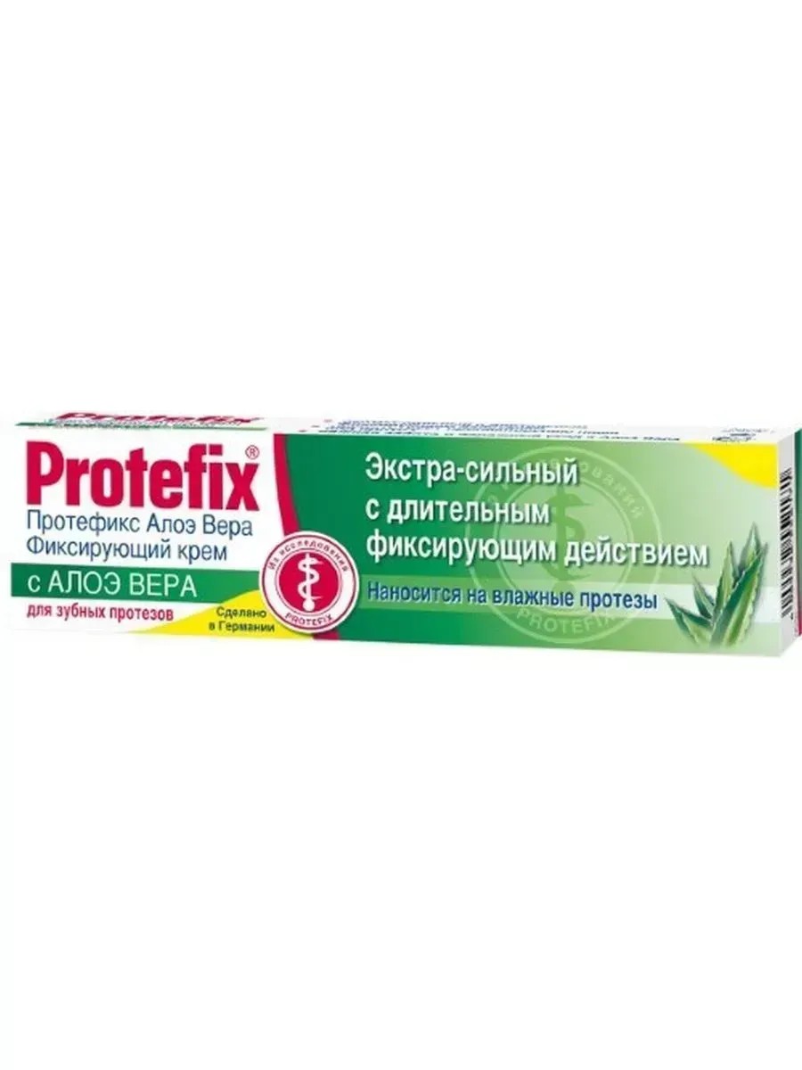 Бренд Protefix (Протефикс)Protefix Крем фиксирующий экстра-сильный для зубных протезов Протефикс Алоэ Вера - практически немедленно возникает сильная фиксацияВнешний вид и свойства: гомогенная и мягкая до слегка зернистой паста малинового цвета, легкий запах ментолаСильная фиксация возникает практически немедленно и продолжается на протяжении 8-12 часов.Применять только при здоровой слизистой оболочке полости рта!Пользуйтесь экстра-сильным фиксирующим кремом Protefix Алоэ Вера очень экономно, так как передозировка снижает удерживающую способность крема.Внимание! Пожалуйста, обратите внимание на следующие указания:• Держите тюбик вертикально, это облегчает применение.• Необходимо давить на тюбик в нижней трети, тогда крем легче дозируется.• Иногда перед употреблением происходит выделение маслянистой жидкости из горлышка, что совершенно не влияет на фиксирующую силу крема. Пожалуйста, просто удалите ее с протеза.• После применения тюбик тщательно закрыть, горлышко тюбика должно оставаться сухим и чистым, проникновение жидкости ведет к затвердеванию крема.• Остатки фиксирующего крема легко снимаются ватным тампоном с растительным маслом.• Хранить в месте, недоступном для детей!• Не использовать после окончания срока годности.