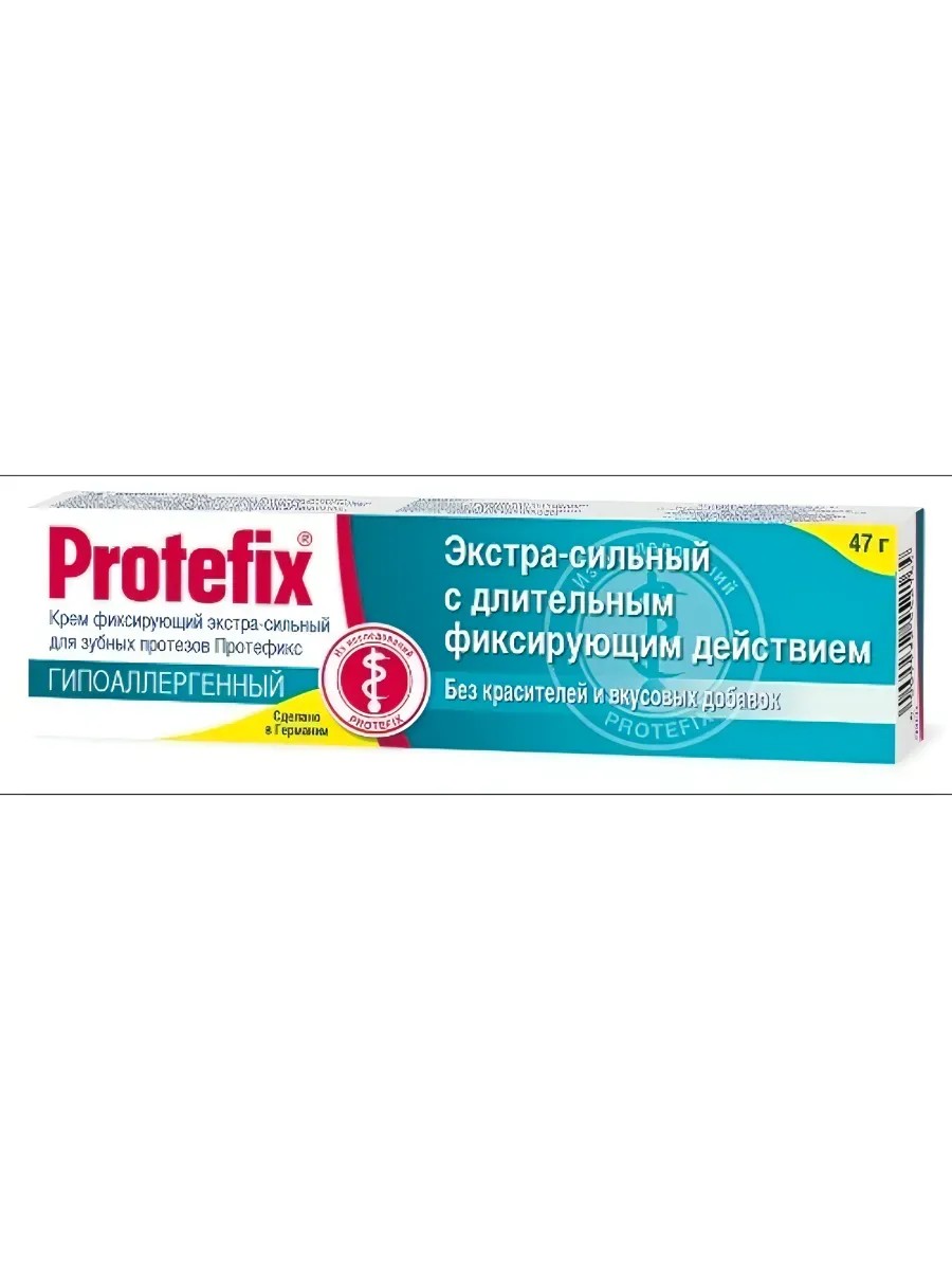 Фиксирующий крем Protefix (Протефикс) Гипоаллергенный рекомендуется для надежной фиксации зубных протезов при повышенном и нормальном слюноотделении. Он легко наносится, сохраняет свои свойства под воздействием горячей и холодной пищи, не меняет вкус еды и напитков, не оказывает негативного воздействия на желудок. Не смывается слюной и равномерно распределяется по всей прилагающей к десне поверхности. Наносится на влажные протезы;