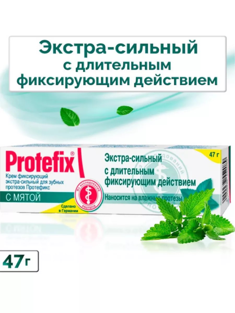 Protefix фиксирующий крем экстра-сильный с мятой применяется для надежной фиксации зубных протезов при повышенном и нормальном слюноотделении. Он легко наносится, сохраняет свои свойства под воздействием горячей и холодной пищи, не меняет вкус еды и напитков, не оказывает негативного воздействия на желудок. Не смывается слюной и равномерно распределяется по всей прилагающей к десне поверхности. Наносится на влажные протезы. Удобен и экономичен в употреблении.