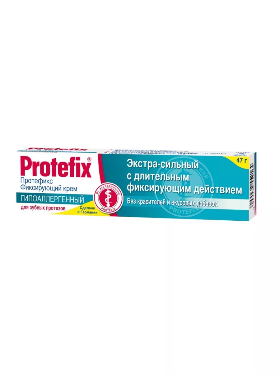 Фиксирующий крем Protefix (Протефикс) Гипоаллергенный не содержит красителей и вкусовых добавок. Рекомендуется для надежной фиксации зубных протезов при повышенном и нормальном слюноотделении. Он легко наносится, сохраняет свои свойства под воздействием горячей и холодной пищи, не меняет вкус еды и напитков, не оказывает негативного воздействия на желудок. Не смывается слюной и равномерно распределяется по всей прилагающей к десне поверхности.