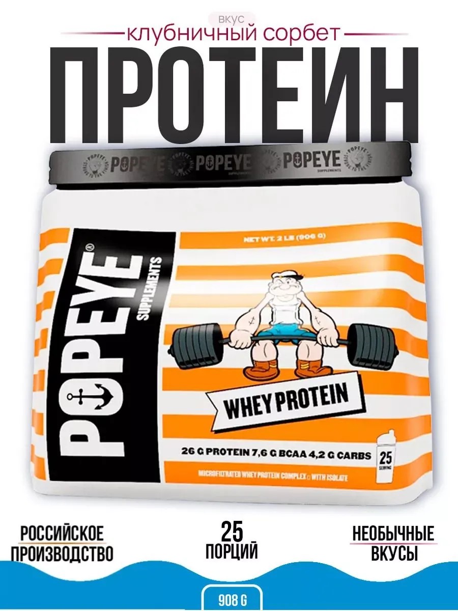 Popeye Supplements Whey Protein is a classic dry mix for a high-protein shake. The recommended method for taking Popeye Whey Protein is as follows: for one serving, mix 35 g of powder with 250 ml of water or skim milk. Drink the protein shake 30-40 minutes before training and within an hour after. You can also add one serving before bed and/or in the morning. On rest days, take one serving between meals. Protein powder is used for mass gain. A comprehensive approach to proper nutrition will allow you to quickly achieve your fitness goals, get your body into perfect shape, and easily maintain it. POPEYE SUPPLEMENTS is a premium line of sports nutrition products, the quality of which is guaranteed by certificates. Want to learn the secret of the POPEYE sailor and become as strong and toned as he is? We're on the same path! Ingredients: Protein blend (whey protein isolate, whey protein concentrate), emulsifier (lecithin), natural and nature-identical flavors, sweetener (sucralose). Storage conditions: Store closed, in a dry place, protected from direct sunlight, at a temperature not exceeding +25°C and a relative humidity of no more than 75%. Shelf life: 24 months from the date of manufacture. The production date is indicated on the packaging.