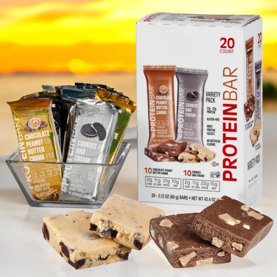 Enjoy a delicious and protein-packed snack with this 20-count variety pack of protein bars, designed to provide long-lasting energy and a rich, satisfying taste. This pack includes two indulgent flavors: Chocolate Peanut Butter Chunk and Cookies and Cream, both made with quality ingredients for a balanced and nutritious bite. Each 2.12 oz bar contains 21g-22g of protein, making it a great option for muscle recovery, sustained energy, and meal replacement. These gluten-free, Kosher-certified bars are crafted without artificial flavors, ensuring a high-quality snack for those who prioritize both taste and nutrition. Individually wrapped for convenience, these protein bars are perfect for busy lifestyles, gym sessions, office snacks, or post-workout recovery. For maximum freshness, store extra bars in the freezer and thaw before eating to maintain their ideal texture. Packaged in a bulk 20-count pack, this protein bar selection is an excellent way to stock up on a delicious and nutritious snack that supports an active lifestyle.