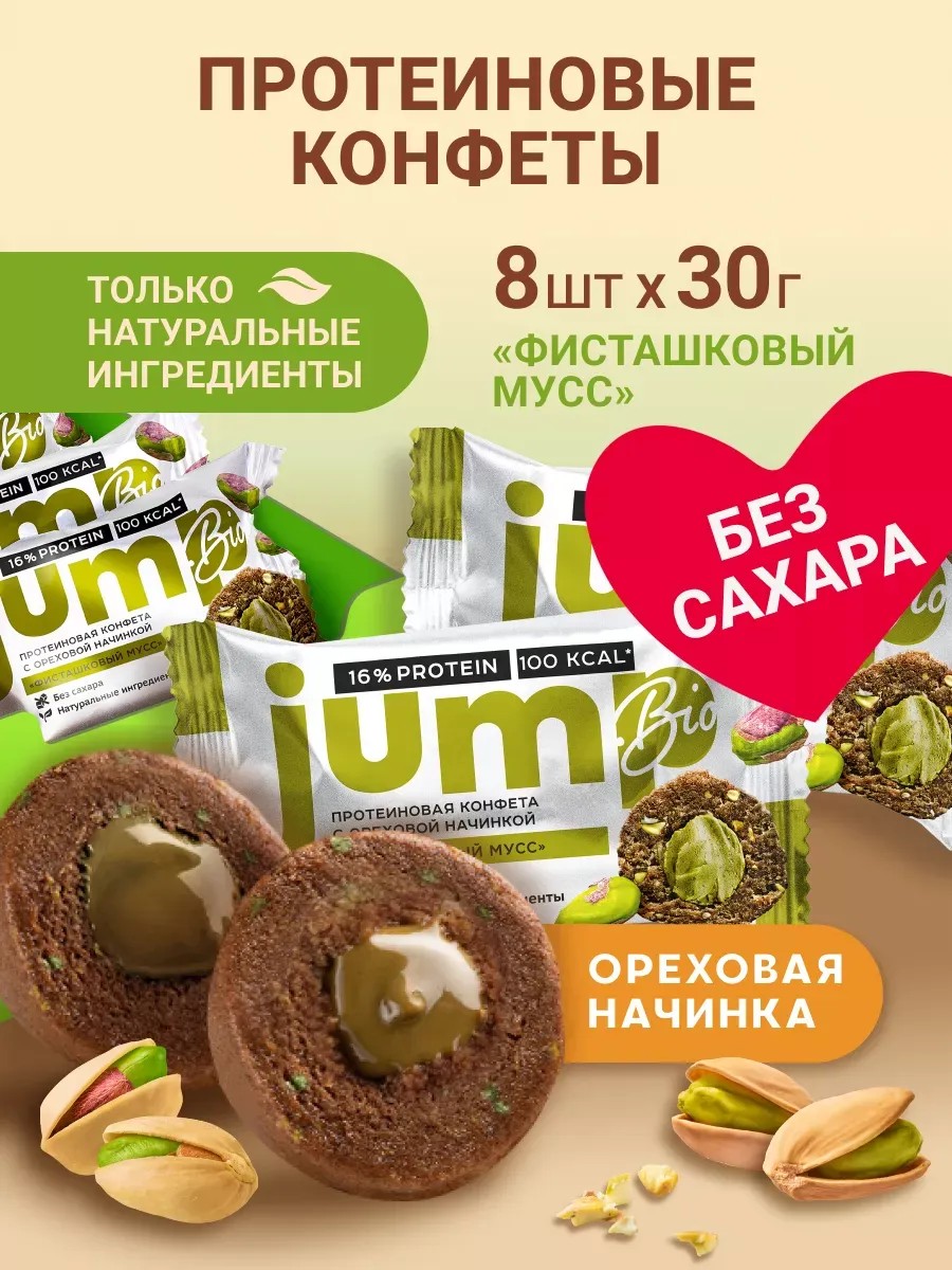 JUMP BIO protein candies with a delicate nut filling are a delicious and healthy snack without added sugar, gluten, or preservatives. They're like a protein bar, but more convenient, fitting even in your pocket. The delicacy of the mousse-like pistachio filling unfolds in one small, yet very healthy, nut-and-fruit candy with an all-natural composition. The ideal balance of calories, fats, carbohydrates (Kcal), and carbohydrates (CFA) will contribute to weight loss and healthy eating. This high-protein snack contains additional sources of protein—milk protein and nuts. Date paste and natural citrus fiber are beneficial for digestion. JUMP BIO sugar-free protein candies are a delicious alternative to unhealthy chocolate, baked goods, and other sweets for adults and children.