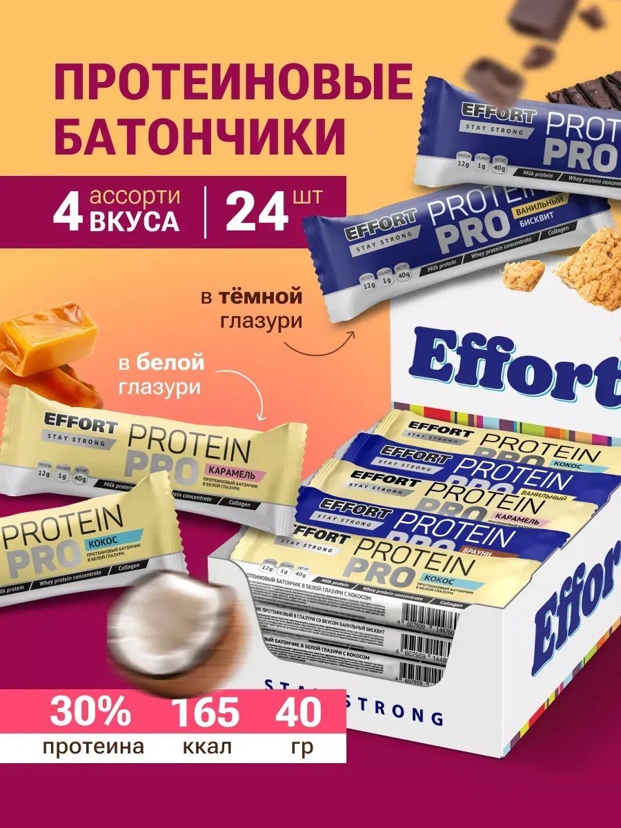Протеиновые вкусняшки EFFORT подойдут для всей семьи. В пп набор входит ассорти из 4 вкусов в белой и шоколадной глазури: карамель, кокос, брауни, ванильный бисквит. Содержит не менее 20% белка. Набор низкокалорийных сладостей благоприятно влияет на работу пищеварительной системы. Шоколадные батончики с whey protien и гидролизированным коллагеном помогают быстрому восстановлению мышечной массы, держать спортивную форму и соблюдать диету. Спортивное питание отлично подходит для похудения и в качестве подарка.