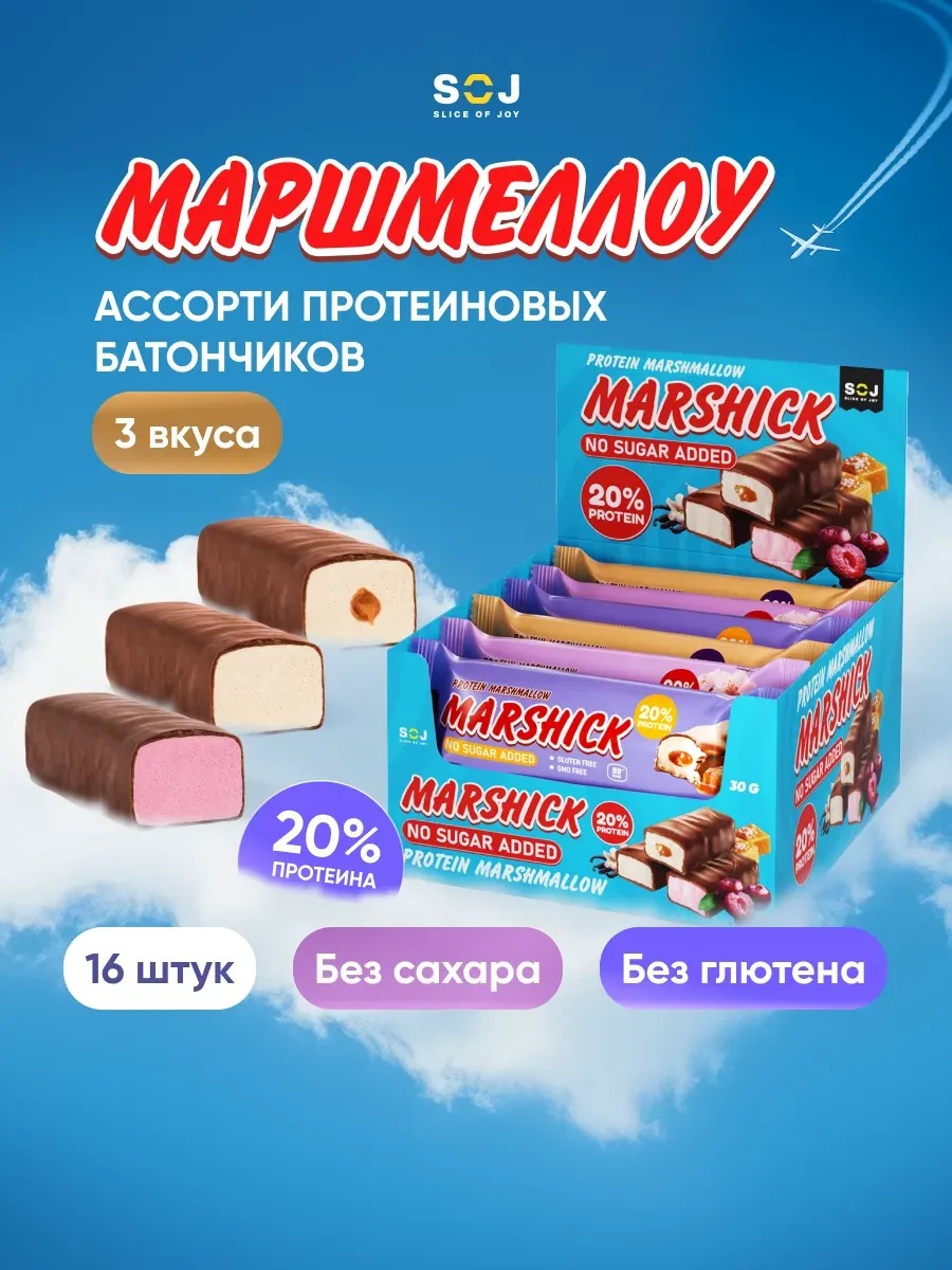 Высокобелковый протеиновый батончик — идеальный перекус для любителей сладостей. В наборе ассорти из 16 штук. Уникальное сочетание молочного шоколада и маршмеллоу разбавит серые будни. Удобно брать с собой в машину, в школу, на прогулку, в путешествие, при перелёте. Идеально к кофе или чаю. Всего 3 вкуса, но мы уверены, что это не помешает найти свой. Ваниль для ценителей нежности. Вишня – фруктовый акцент для ярких личностей. Соленая карамель – сладко-солёный эксперимент для самых смелых гурманов. Высокое содержание белка в каждом. Он важен для роста и восстановления мышц, поэтому он идеально подходит для спортсменов и людей, следящих за своей фигурой. Натуральные ингредиенты. Изготовлен из качественных ингредиентов без добавления сахара, ГМО и глютена. Это вкусный и здоровый перекус для тех, кто заботится о своём здоровье и физической форме и качественном наборе веса. Для тех, кто соблюдает безглютеновую диету и спортивное фитнес питание. Продукт с протеином низкокалорийный пп десерт с супер составом: белковый, безуглеводный, c минимальным количеством быстрых углеводов. Подарите полезную питательную вкусняшку близкому человеку или возьмите для себя. Если для вас зож и диетический спортпит это не просто слова, то энергетический батончик Marshick станет вашим верным спутником. Наслаждайтесь каждым укусом вместе с SOJ!