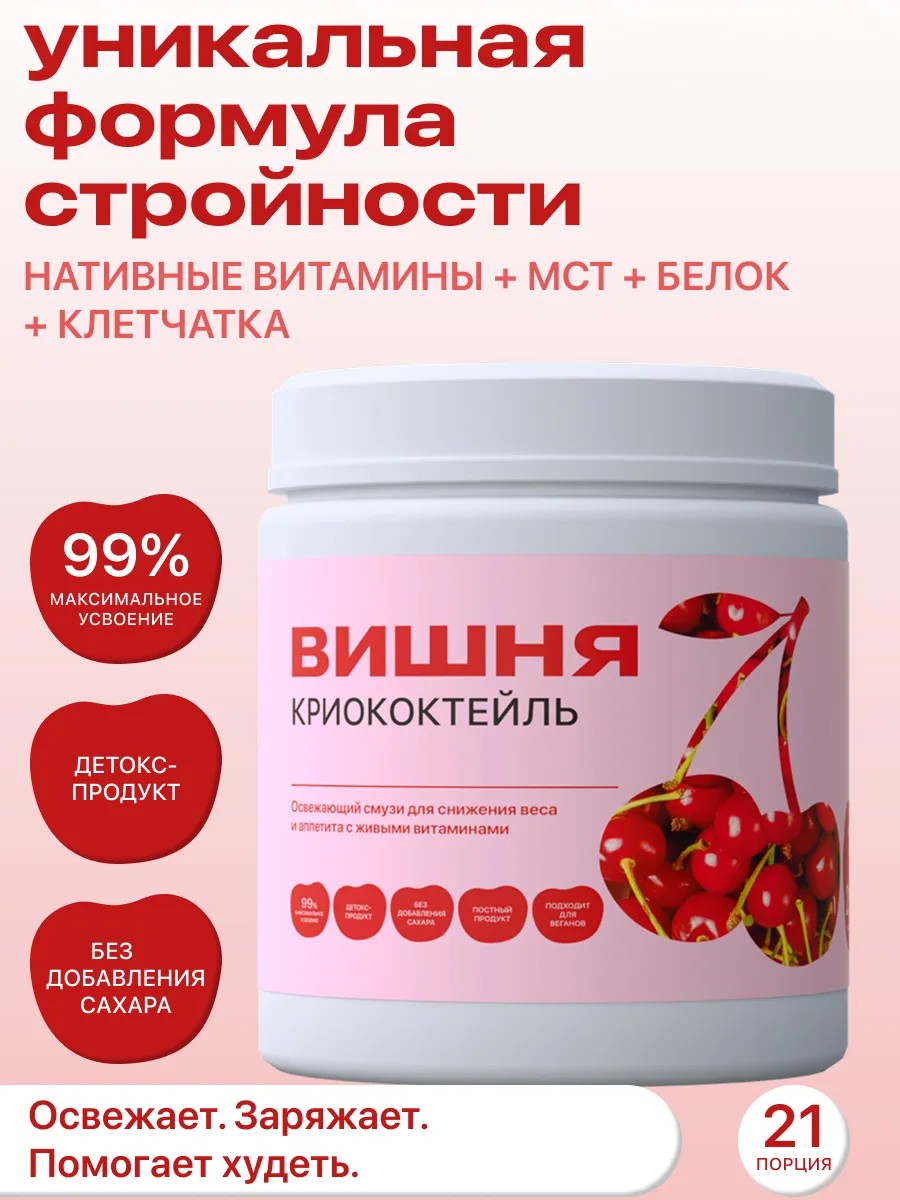 The Cherry Protein Shake is a delicious and effective way to maintain your health and figure. It contains plant-based protein enriched with fruits, berries, and plant extracts, making it not only healthy but also delicious. This shake will help you recover after workouts, maintain your beauty and health, and will also be a reliable aid in weight loss and cutting. The convenient plastic jar with a measuring spoon allows you to easily prepare the shake at any time. It maintains energy, helps control appetite, and helps you lose weight without dieting. 1 serving = 800 g of vegetables and fruits. Ideal for healthy eating, fasting days, snacking, fasting, and a vegan diet. 21 servings per package.