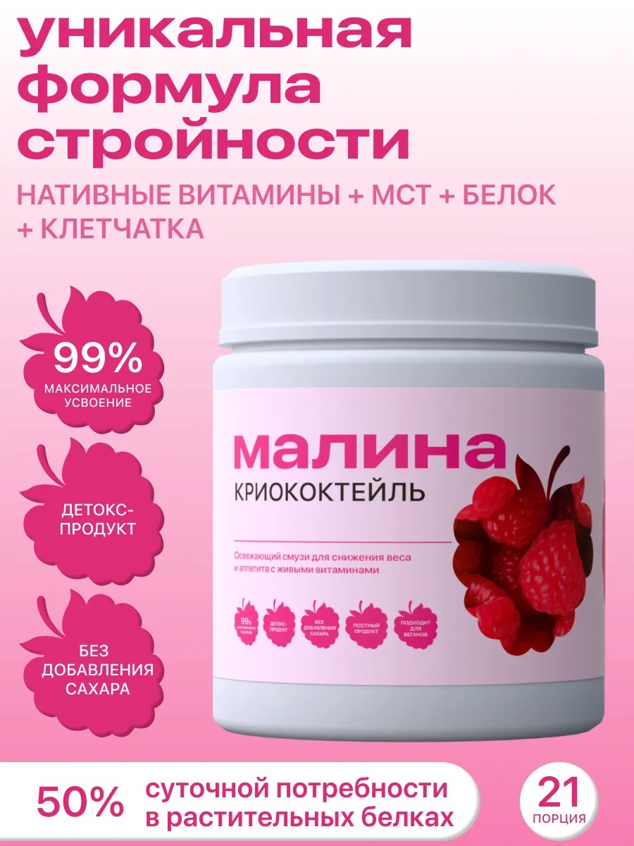 Криококтейль "Малина" - это вкусный и эффективный способ поддерживать свою фигуру и здоровье. Этот растительный протеин с добавлением криопорошков и MCT-масла поможет вам снизить вес, улучшить обмен веществ и укрепить иммунитет. Благодаря высокому содержанию белка (40 г/100 г) и низкому содержанию жиров (3.2 г/100 г) этот коктейль станет идеальным дополнением к вашему рациону, особенно если вы следите за фигурой или занимаетесь спортом. Просто смешайте порошок с водой или молоком, и наслаждайтесь освежающим вкусом малины. Содержит нативные витамины и антиоксиданты, сохраняемые крио-обработкой. Поддерживает энергию, помогает контролировать аппетит и снижать вес без диет. 1 порция = 800 г овощей и фруктов. Идеально для ПП, разгрузочных дней, перекуса, поста и веганского рациона. 21 порция в упаковке. Не содержит животных компонентов, поэтому идеально подходит для веганов и в пост.