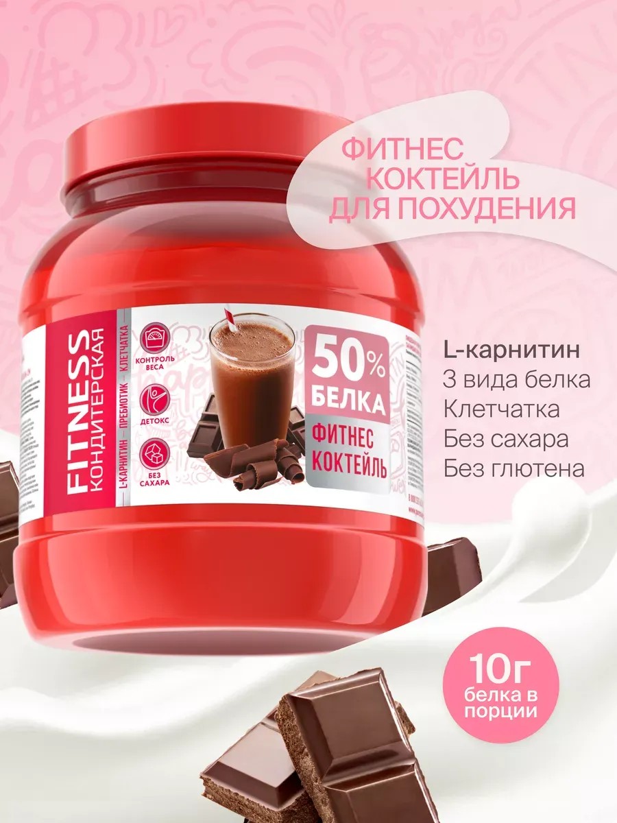 Результат обязательно будет – но для этого нужна помощь опытных профессионалов. ГК PURE десять лет назад первой начала производить в России протеиновые коктейли. Накопленный за годы опыт и результаты новых исследований позволили сделать идеально сбалансированный продукт для похудения: протеиновый фитнес коктейль «FitnessКондитерская» !Фитнес коктейль содержит 50% высококачественного белка и пребиотическое волокно, и дополнительно обогащен L-карнитином, который способствует расщеплению жиров и снижает уровень вредного холестерина. А пребиотическое волокно улучшает пищеварение и выводит из организма токсины и шлаки. Фитнес коктейль быстро и надолго обеспечит чувством насыщения и позволит сократить дневное потребление калорий. Фитнес коктейль – это дополнительный источник белка для оптимизации вашего питания, а такжеудобный и эффективный способ снизить калорийность дневного рациона, не испытывая при этомчувства голода. За счет клетчатки и пребиотического волокна полидекстрозы он способствует нормализации пищеварительных процессов. Дополнительно содержит L-карнитин, который увеличивает транспорт жирных кислот, что существенно способствует жиросжиганию.