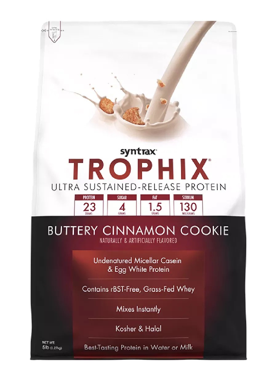 TROPHIX от компании Syntrax - это многокомпонентный протеин, состоящий из концентрата молочного протеина, мицеллярного казеина, концентрата сывороточного протеина, яичного альбумина и глютаминовых пептидов. Подходит для приема в любое время дня, так как содержит и быстроусваиваемые и медленноусваиваемые протеин. Главное его отличие от не менее популярного Syntrax Matrix - это то, что основным его источником белка является казеин - медленно усваивающийся протеин, который надолго создает чувство сытости, а также защищает и питает мышцы длительный период времени. Помимо вкусных протеиновых коктейлей, с Trophix можно приготовить диетическую выпечку. Внутри продукта находится пакет с влагоудерживающим агентом. Будьте внимательны!