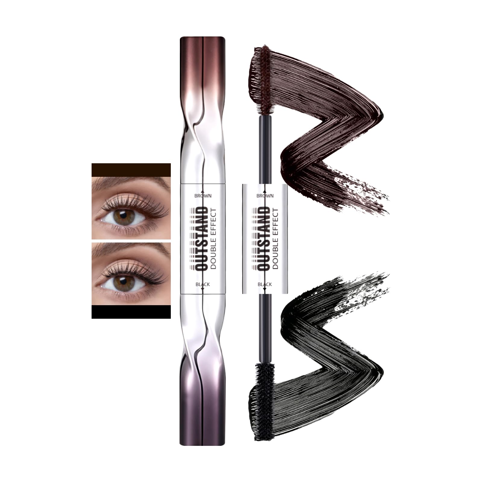 Features: Name: Double-ended mascara Color: Black Brown Package Contents: 1 mascara Product Features: 2-in-1 double-ended and two colors. 3D length. Volumizing and curling. Waterproof and long-lasting. Directions for Use: After curling your lashes with an eyelash curler, take an appropriate amount of mascara and apply it in a "Z" shape from the base of your lashes to the tip of your eyes, ensuring that each lash is evenly coated. CAUTIONS: For external use only. Keep out of reach of children. Do not swallow. Avoid contact with eyes. Do not use if irritation occurs or if a rash develops. Store in a cool, dry place and avoid direct sunlight.Easy to remove: The formula is hydrophilic and can be easily washed off with regular facial cleansers or warm water, reducing eye irritation. Gentle and non-irritating: The rich ingredients in this mascara are gentle and non-irritating. At the same time, they nourish the eyes, making them strong and resistant to breakage. The effect after application is stunning. It can magnify the eyes and create long, 360 curls. Lightweight and clump-free: The mascara has a fine texture and is easy to apply, adhering evenly. After use, lashes don't become stiff or clumpy, and each lash remains clear after application. Once dry, it doesn't stick to the eyelids, is sweat-resistant, has a strong waterproof effect, and can maintain a well-defined curl all day long. Quick-drying: This mascara contains quick-drying ingredients that rapidly create a film and set the shape quickly, guaranteeing a smudge-proof look while blinking and keeping each eyelid separated. Dual-headed mascara: This mascara features a dual-headed, two-tone design, equipped with two different brush heads to meet various needs. One side is black, while the other is brown. One mascara can be used in two ways.Prreal Mascara à double tête, imperméable, noir et marron, 3D Curling Long Eyelashes Iron Volume Length Mascaras, Non-Clumping, Longlasting, Fullness and Defined Eye Makeup Noir marron.DESCRIPTION DU PRODUIT Caractéristiques : Nom : mascara à double extrémité. Couleur : noir marron Contenu de l'emballage : 1 mascara Caractéristiques du produit : 2 en 1 double extrémité et deux couleurs. Longueur 3D. Volumineux et curling. Imperméable et durable. Mode d'emploi : Après avoir bouclé vos cils avec un curleur à eyelash, prenez une quantité appropriée de mascara et appliquez-le sous une forme « Z » de la racine des cils à la pointe des yeux, en veillant à ce que chaque eyelash soit uniformément recouvert de mascara. CAUTlON : Pour usage externe uniquement. Tenir hors de portée des enfants. Donot swallow. Évitez le contact avec les yeux. Ne pas utiliser en cas de signes d'irritation ou d'occur rapide. Conservez dans un endroit frais et sec et évitez la lumière directe du soleil.Facile à enlever : la formule est hydrophile et peut être facilement lavée avec des nettoyants faciaux ordinaires ou de l'eau chaude, ce qui réduit les douleurs sur les yeux. Doux et non irritant : les ingrédients riches dans le mascara sont doux et non irritants. En même temps, ils peuvent nourrir les yeux et les rendre forts et résistants à la casse. L'effet après utilisation est astonisant. Il peut magnifier les yeux et rendre le mascara long et bouclé à 360 . Léger et sans bourdonnement : le mascara a une texture fine et est facile à appliquer, à adhérer uniformément. Après utilisation, les cils ne deviennent pas durs ou agglutinés, et chaque eyelash reste clair après l'application. Après séchage, il ne colle pas aux paupières, ne craint pas la transpiration, a un fort effet imperméable à l'eau, et peut maintenir une boucle bien définie pendant toute la journée. Séchage rapide : ce mascara contient des composants à séchage rapide, qui créent rapidement un film et fixent rapidement la forme, en lisant la garantie de l'écrasement de l'œil tout en clignotant et en gardant chaque eyelfe séparé. Mascara à double tête : ce mascara offre un design bicolore à double tête, équipé de deux têtes de brosse de type pour répondre à différents besoins. Un côté est noir tandis que l'autre est marron. Un mascara peut être achieve deux.