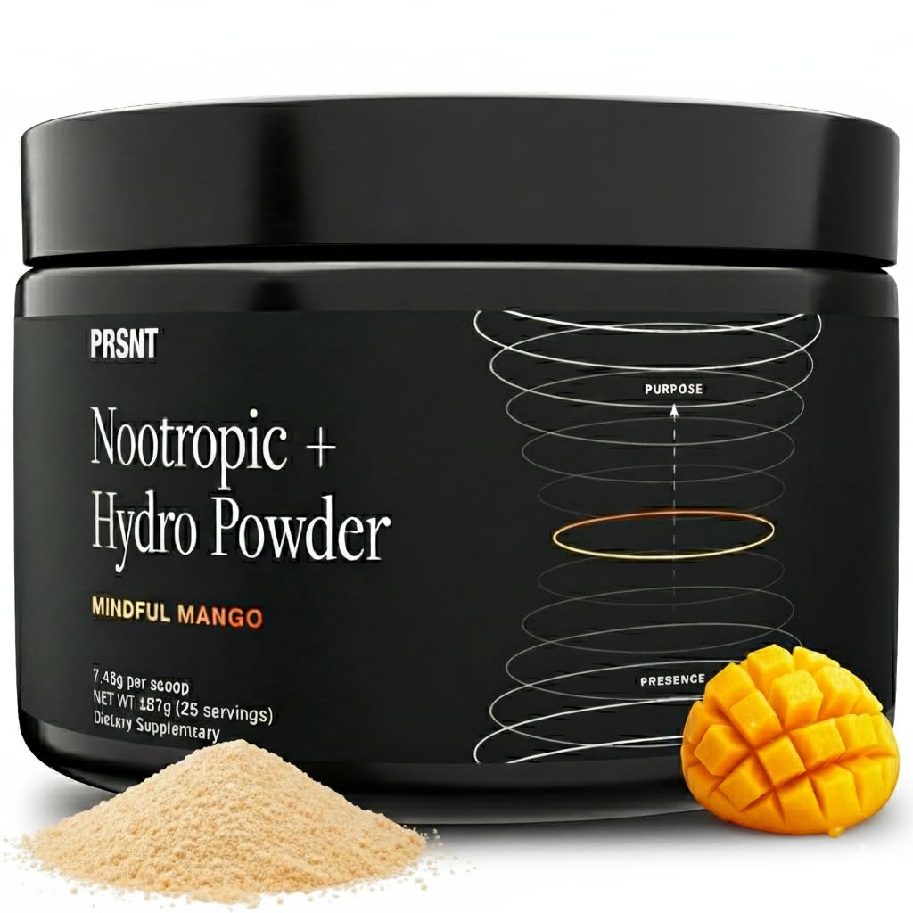 PRSNT Nootropic Focus Powder | Mango 25 Servings | Caffeine-Free Sugar-Free | Supports Focus Energy Mental Clarity | Nootropic + Electrolytes Hydration Focus Drink Mix