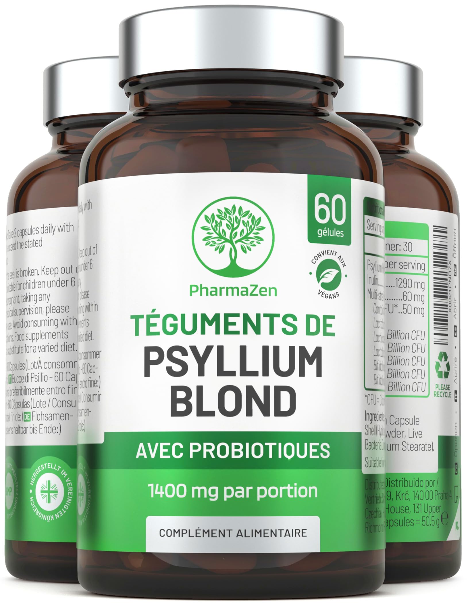 OPTIMAL SUPPORT FOR WELL-BEING - Discover a supplement that supports your daily well-being, developed by PharmaZen. With research-selected ingredients, each product is designed to help you achieve your health goals, with careful attention to precision and quality. EFFORTLESS DAILY FIBER - Forget unpleasant powders: these psyllium husk capsules are a quick way to increase your fiber intake every day. Odorless, tasteless, and easy to swallow, they fit perfectly into an active lifestyle. Used regularly, they are a great way to improve your gut health. PREBIOTIC PROBIOTIC - Natural psyllium is an excellent support (prebiotic) for the good bacteria (probiotics) that make up a healthy gut microbiome. With 6 billion CFU of 5 scientifically selected probiotic strains per dose, this natural supplement effectively supports your gut health. HIGH STRENGTH, PURE NATURAL – Completely natural and 99 pure, this fiber supplement provides a simple daily dose: 1400 mg of psyllium husk and 6 billion CFU of probiotics. Each container contains 60 capsules for a one-month supply. Take two capsules with a glass of water and a meal. DAILY DIGESTIVE SUPPORT – Digestive discomfort can affect every aspect of life, from work to social interactions, and cause embarrassment. Fiber is essential for gut health, and these psyllium husk capsules are rich in natural fiber and probiotic strains to support your gut microbiome.SOUTIEN OPTIMAL POUR LE BIEN-ÊTRE - Découvrez un complément qui soutient votre bien-être quotidien, développé par PharmaZen. Avec des ingrédients sélectionnés grâce à la recherche, chaque produit est conçu pour vous aider à atteindre vos objectifs santé, avec une attention particulière à la précision et à la qualité. DES FIBRES AU QUOTIDIEN SANS EFFORT – Oubliez les poudres désagréables : ces gélules de téguments de psyllium sont une manière rapide d'augmenter votre apport en fibres chaque jour. Inodores, sans goût et faciles à avaler, elles s'intègrent parfaitement dans un mode de vie actif. Utilisées régulièrement, elles sont un excellent moyen d'améliorer votre santé intestinale. PRÉBIOTIQUE PROBIOTIQUE – Le psyllium naturel est un excellent support (prébiotique) pour les bonnes bactéries (probiotiques) qui composent un microbiome intestinal sain. Avec 6 milliards de CFU de 5 souches probiotiques scientifiquement sélectionnées par dose, ce complément naturel soutient efficacement votre santé intestinale. HAUTE CONCENTRATION, PURE ET NATURELLE – Complètement naturel et pur à 99 , ce complément en fibres offre une dose quotidienne simple : 1400 mg de téguments de psyllium et 6 milliards de CFU de probiotiques. Chaque boîte contient 60 gélules pour un mois de cure. Prenez deux gélules avec un verre d'eau et un repas. SOUTIEN DIGESTIF QUOTIDIEN – L'inconfort digestif peut affecter tous les aspects de la vie, du travail aux interactions sociales, et provoquer un certain embarras. Les fibres sont essentielles à la santé intestinale, et ces gélules de téguments de psyllium sont riches en fibres naturelles et en souches de probiotiques pour soutenir votre microbiome intestinal.