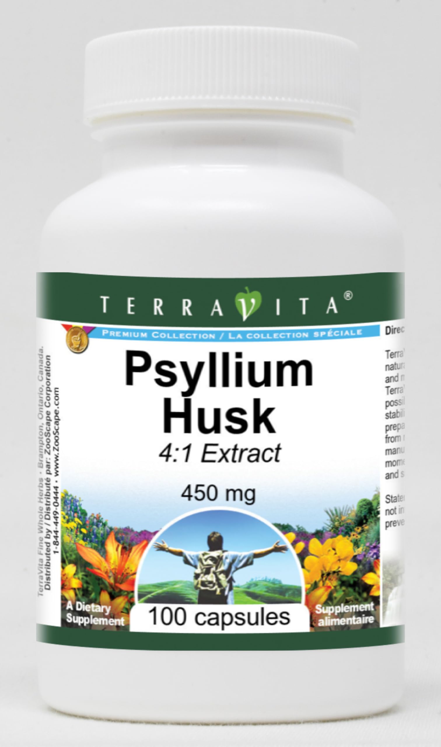 Psyllium Husk 4:1 Extract - 450 mg (100 capsules, ZIN: 524775) Packaged in the United States in a cGMP certified facility (current Good Manufacturing Practice). No fillers. Manufacturer: TerraVita Size: 100 capsules Easy-to-swallow Capsules in a sealed bottle. Ingredients: Psyllium Husk 4:1 Extract - 450 mg, Gelatin, Water