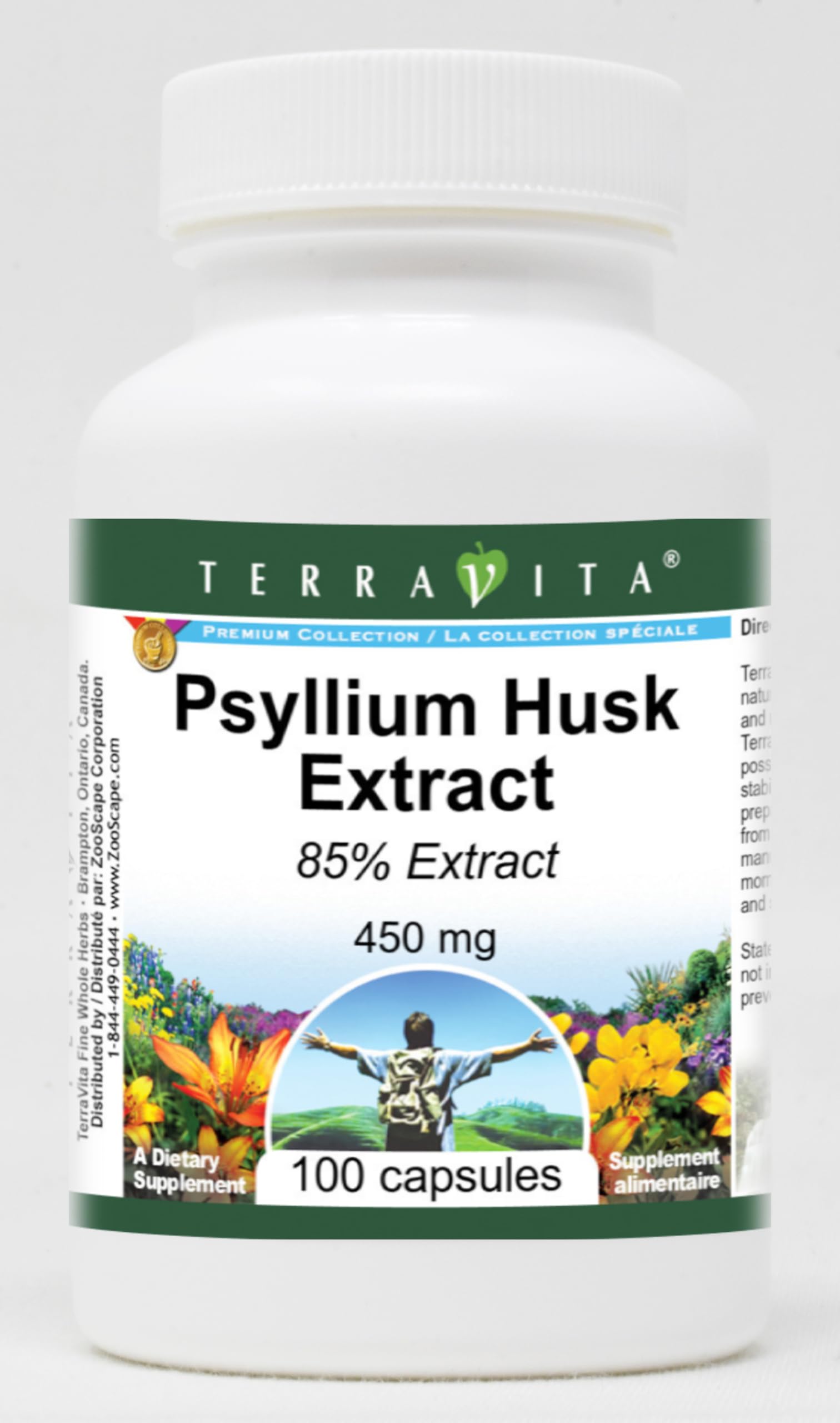 Psyllium Husk 85 Extract - 450 mg (100 capsules, ZIN: 520088) Packaged in the United States in a cGMP certified facility (current Good Manufacturing Practice). No fillers. Manufacturer: TerraVita Size: 100 capsules Easy-to-swallow Capsules in a sealed bottle. Ingredients: Psyllium Husk 85 Extract - 450 mg, Gelatin, Water