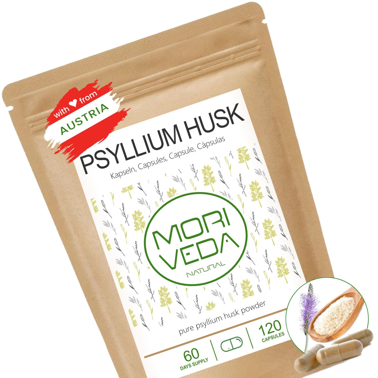 PURELY NATURAL AND 100 VEGAN: Free from magnesium stearate, dioxides, artificial flavors, colors, and preservatives. Lactose-free, fructose-free, gluten-free, and GMO-free. From USDA-controlled cultivation and ISO-certified processing. CONTENTS: Psyllium husks are primarily composed of polysaccharides (cellulose, hemicellulose, and lignin) which, as dietary fiber, stimulate digestion and are necessary for proper bowel function. EFFECT: Psyllium husks aid in natural bowel cleansing. They swell in the intestines, binding stubborn pollutants, which are then excreted together. The fiber stimulates digestion and helps combat constipation. In cases of diarrhea, their swelling ability helps retain excess fluid and regulate bowel movements. PSYLLIUM HUSK: The active ingredients are high-quality mucilage (swellable fiber) which, when combined with water, can swell and support intestinal function. SUPERFOOD: Indian psyllium husks are purely natural fibers and support natural digestion and intestinal health.PUREMENT NATUREL ET 100 VEGAN: Sans stéarate de magnésium, dioxydes, arômes artificiels, colorants et conservateurs. Sans lactose, fructose, gluten et OGM. De la culture contrôlée par l'USDA et du traitement certifié ISO. CONTENU : Les enveloppes de psyllium sont principalement composées de polysaccharides (cellulose, hémicellulose et lignine) qui, en tant que fibres alimentaires, stimulent la digestion et sont nécessaires au bon fonctionnement de l'intestin. EFFET: Les enveloppes de psyllium aident au nettoyage intestinal naturel. Ils gonflent dans le lintestin, les polluants tenaces sont liés et excrétés ensemble. Les fibres stimulent la digestion et aident à lutter contre la constipation. En cas de diarrhée, la capacité de gonfler aide à retenir l'excès de liquide et à réguler le flux intestinal. PSYLLIUM HUSK: Les ingrédients actifs sont du mucilage de haute qualité (fibre gonflable) qui, en combinaison avec de l'eau, peut gonfler et soutenir la fonction intestinale. SUPERALIMENT: Les enveloppes de psyllium indiennes sont des fibres purement naturelles et soutiennent la digestion naturelle et la santé intestinale.Psyllium husk capsules 100 poudre de psyllium husk - digestion intestinale détox - vegan et sans gluten - 120 capsules par MoriVeda