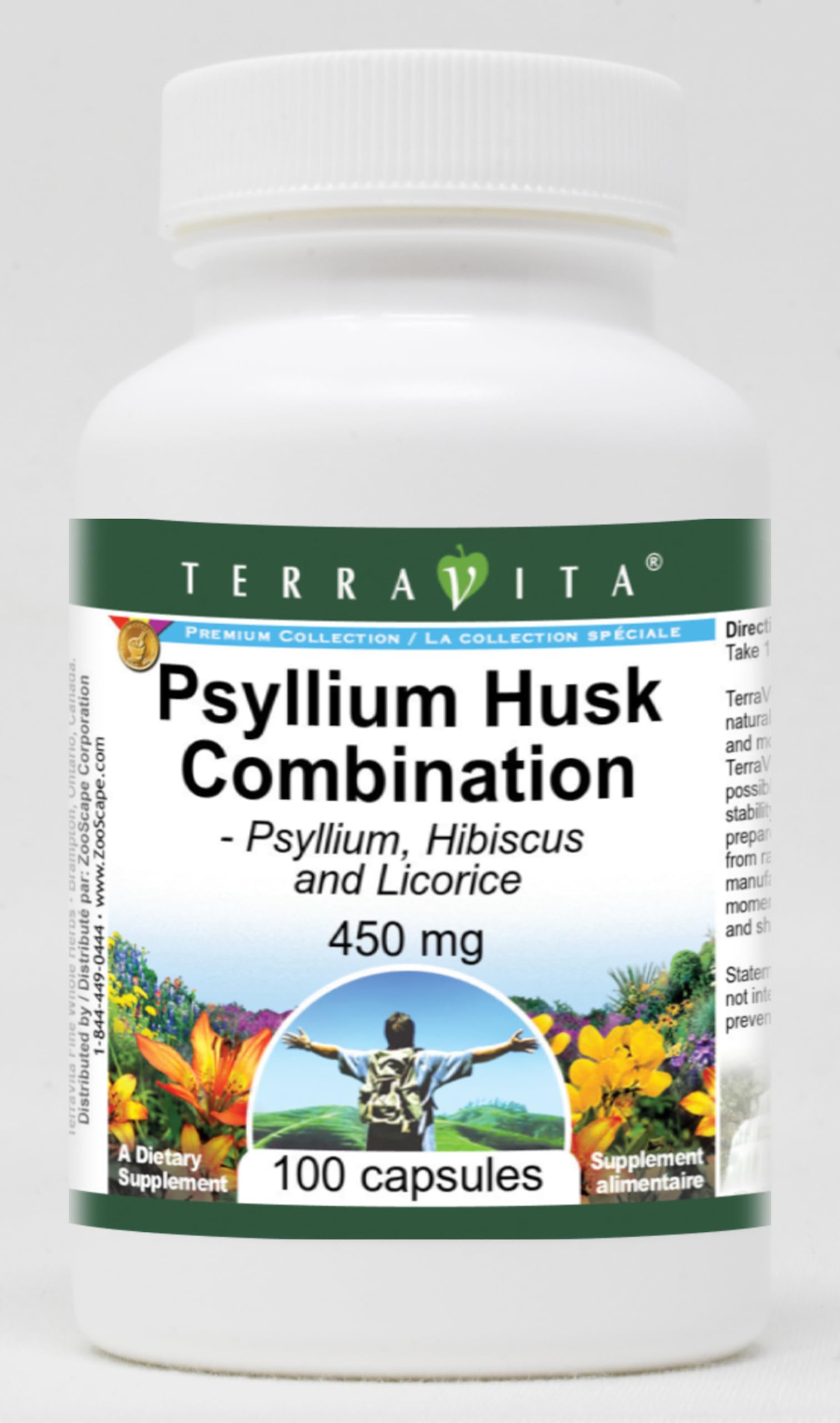 Psyllium Husk Combination - Psyllium, Hibiscus and Licorice - 450 mg (100 capsules, ZIN: 512569) Packaged in the United States in a GMP certified facility (Good Manufacturing Practice). No fillers. Manufacturer: TerraVita Size: 100 capsules Easy-to-swallow Capsules in a sealed bottle. Ingredients: Gelatin, Water, Psyllium Husk - 150 mg, Hibiscus Flower - 150 mg, Licorice Root - 150 mg