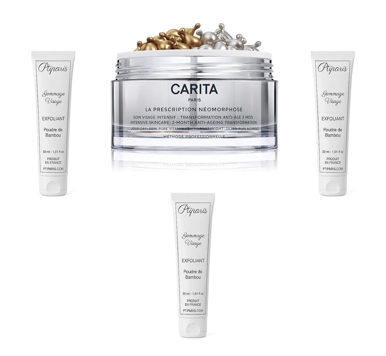 Discover this exclusive Ptiparis set with 3 scrubs of 30 ml and the Carita Neomorfose formula. Ptiparis Scrub offers a unique skincare experience, gently removing dead cells to reveal softer, more radiant skin. The carefully developed formula helps refine skin texture and even out skin tone. This set is ideal for a complete and effective skincare routine. The scrub's pleasant texture provides an immediate feeling of freshness upon application. Perfect for all skin types, this set allows you to enjoy a professional beauty ritual at home. For best results, use the scrub once or twice a week with gentle circular motions and then rinse thoroughly with warm water. 2-month treatment: 60 x 2 capsules of pure retinol – pure vitamin C. A professional concentration for an anti-aging transformation. The Neomorfose recipe is a powerful two-month anti-aging facial care program consisting of ultra-protective single-dose capsules that deliver high concentrations of dermatological active ingredients: 22 Pure Vitamin C during the day (gold capsule) and 0.19 Pure Retinol at night (silver capsule). The combination of these two active ingredients, with these high percentages, allows you to permanently treat all signs of aging such as wrinkles, firmness, radiance, and dark spots, visibly transforming the skin in just 15 days. To open the capsule: twist the cap twice by squeezing, then squeeze the contents onto your fingertips. In the morning, apply the contents of a gold Vitamin C capsule to your face as a replacement for your Carita serum, followed by your cream and a minimum SPF 15 UV filter. In the evening, apply the contents of a silver Retinol capsule to your face as a replacement for your Carita serum, followed by your cream. 60 x 2 capsules Pure Retinol - Pure Vitamin CA professional concentration for an anti-aging metamorphosis. The Neomorphose formula is a powerful two-month anti-aging facial transformation program, consisting of ultra-protective single-dose capsules that deliver high concentrations of dermatologically active ingredients: 22 pure vitamin C during the day (gold capsule) and 0.19 pure retinol at night (silver capsule). The combination of these two active ingredients at these high levels provides long-lasting treatment for all signs of aging, such as wrinkles, firmness, radiance, and blemishes, visibly transforming the skin after just 15 days. To open the capsule, pinch the tip and squeeze the contents onto your fingertips. In the morning, as a replacement for your Carita serum, apply the contents of a gold vitamin C capsule to your face, followed by your cream and a minimum SPF 15 UV filter. In the evening, apply the contents of a silver retinol capsule to your face as a replacement for your Carita serum, followed by your cream. INGREDIENTS DIMETHICONE, ASCORBIC ACID, TRISILOXANE, DIMETHICONOL, SILICA DIMETHYL SILYLATE [NANO] SILICA DIMETHYL SILYLATE, DIMETHICONE VINYL TRIMETHYLSILOXYSILICATE CROSSPOLYMER, TOCOPHERYL ACETATE DIMETHICONE E, DIMETHICONE E VINYL DIMETHICONE CROSSPOLYMER, TOCOPHERYL ACETATE, GLYCINE SOJA OIL SOYBEAN OIL, RETINOL DIRECTIONS FOR USE Apply to damp skin in circular massages and then rinse easily with warm water. Use once or twice a week. SAFETY WARNING Avoid contact with eyes. In case of contact, rinse thoroughly with clean water. For external use only. Keep out of reach of children. Do not use on irritated or broken skin. If skin reactions occur, discontinue use and consult a healthcare professional. See morePRACTICAL SIZE: 30ml tubes perfect for regular use or travel. EASY TO USE: Apply to damp skin in circular massages and then rinse easily with warm water. LUXURY TEXTURE: Creamy and pleasant texture that provides a soft feeling during application. GENTLE EXFOLIATING: Delicate exfoliating formula that helps remove dead cells for smoother and more radiant skin. CONTENTS OF THE SET: 3 tubes of Ptiparis scrub of 30 ml each, plus Carita Neomorphose prescription care for a complete beauty ritual.Carita gezichtsscrubset met 3 scrubs 30 ml en het recept Neomorfose van Carita Ontdek deze exclusieve Ptiparis set met 3 scrubs van 30 ml en het recept Neomorfose van Carita. Ptiparis Scrub biedt een unieke verzorgingservaring voor je huid, verwijdert dode cellen voorzichtig om een zachtere en stralende huid te onthullen. De zorgvuldig ontwikkelde formule helpt de huidtextuur te verfijnen en de teint gelijkmatig te maken. Deze set is ideaal voor een complete en effectieve verzorgingsroutine. De aangename textuur van de scrub zorgt voor een onmiddellijk fris gevoel bij het aanbrengen. Perfect voor alle huidtypes, deze set maakt het mogelijk om thuis van een professioneel schoonheidsritueel te genieten. Voor het beste resultaat gebruik je de scrub één of twee keer per week met zachte cirkelvormige bewegingen en spoel daarna grondig af met warm water. 2 maanden kuur 60 x 2 capsules pure retinol – pure vitamine C. Een professionele concentratie voor een anti-aging metamorfose. Het Neomorfose recept is een krachtig anti-aging gezichtsverzorgingsprogramma gedurende twee maanden, bestaande uit ultra-beschermende capsules voor één dosis die hoge concentraties dermatologische werkzame stoffen mogelijk maken: 22 vitamine C Pure overdag (gouden capsule) en 0,19 Pure retinol 's nachts (zilveren capsule). De combinatie van deze twee werkzame stoffen met deze hoge percentages maakt het mogelijk om alle tekenen van veroudering zoals rimpels, stevigheid, straling en vlekken permanent te behandelen om de huid al vanaf 15 dagen zichtbaar te transformeren. Om de capsule te openen: draai het opzetstuk twee keer door te knijpen en druk vervolgens de inhoud op de vingertoppen. Breng 's ochtends als vervanging voor uw Carita-serum de inhoud van een gouden vitamine C-capsule aan, gevolgd door uw crème en minimaal SPF15 UV-filter op het gezicht. Breng 's avonds de inhoud van een zilveren Retinol capsule aan op het gezicht als vervanging voor je Carita-serum, gevolgd door je crème. 60 