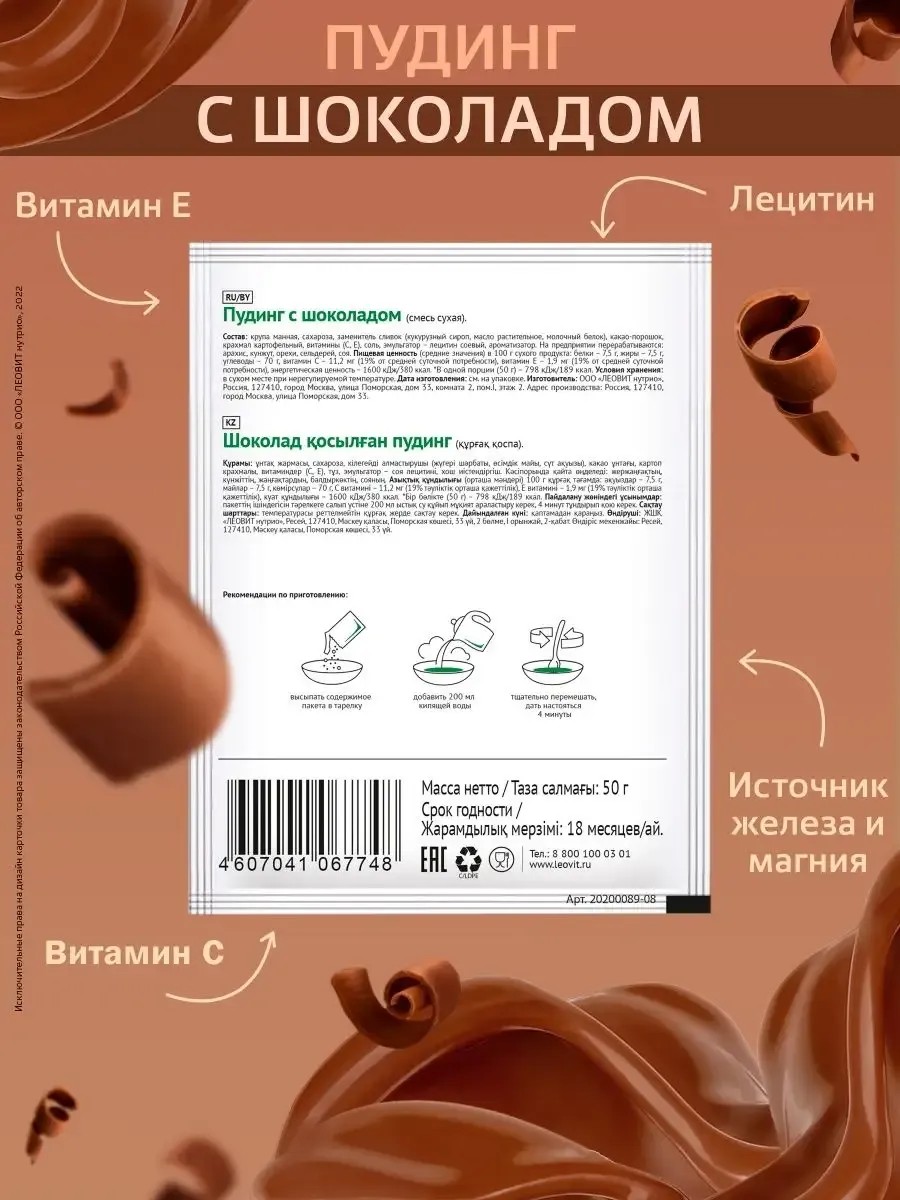 Chocolate Pudding. 12 sachets of 50 g each. 600 g packaging. LEOVIT. Enjoy this healthy dessert from LEOVIT, which combines rich chocolate flavor with the benefits of natural antioxidants. This treat will not only bring pleasure but will also help improve your health and maintain youthful skin. We've additionally enriched the formula with important antioxidants – vitamins C and E. Vitamin C strengthens the immune system and is beneficial for the skin, as it plays a key role in the production of elastin and collagen. And vitamin E is rightfully called the "vitamin of youth," as it slows the signs of aging, promotes cell renewal, and improves skin elasticity. This pudding is delicious, healthy, and filling enough to serve as a separate meal. Another plus – it's very easy to prepare. Empty the contents of the sachet into a bowl, add 200 ml of boiling water, stir thoroughly, and wait 4 minutes. Ingredients: semolina, sucrose, vegetable cream substitute, cocoa powder, starch, vitamins (C, E), salt, emulsifier-soy lecithin, flavoring. Enjoy your meal!