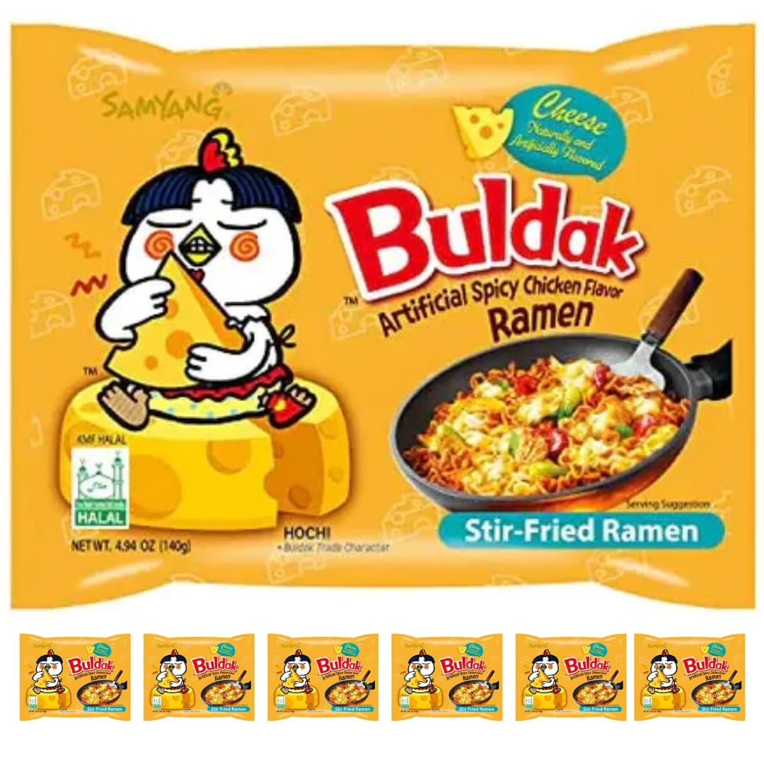 is a popular brand of instant noodles in South Korea. The noodles are known for their extremely spicy flavor, achieved through the use of chili peppers and other spices. The noodles are typically prepared with chicken, vegetables, and other ingredients for a quick and easy meal. The brand is very popular in South Korea and is also sold in other parts of Asia and even in the United States. The noodles are considered something for the brave and adventurous, as their spicy taste is not for everyone. INGREDIENTS Wheat flour, modified tapioca starch, palm oil, wheat gluten, salt, glycerin, soybean oil, acidity regulators (E501(i), E500, E339(ii), E330), thickener (E412), purified water, emulsifier (E322), green tea flavoring oil. Soup: Artificial cheese flavoring water, soy sauce, white sugar, artificial chicken flavoring powder, soybean oil, chili pepper powder, paprika powder, onion, garlic, modified potato starch. Powder: Mozzarella cheese powder, toasted sesame seeds, toasted purple tang. INSTRUCTIONS Add hot water, wait a few minutes, then add the included flavor packet. See moreSam Yang Buldak Noodles Lot de 7 sachets de nouilles, chicots chauds, ramen plats, 140 gDESCRIPTION DU PRODUIT DESCRIPTION DU PRODUIT est une marque populaire de pâtes instantanées en Corée du Sud. Les nouilles sont connues pour leur goût extrêmement piquant obtenu grâce à l'utilisation de piment et d'autres épices. Les pâtes sont généralement préparées avec du poulet, des légumes et d'autres ingrédients pour un plat rapide et facile. La marque est très populaire en Corée du Sud et est également vendue dans d'autres régions d'Asie et même aux États-Unis. Les pâtes sont considérées comme quelque chose pour les courageux et les aventuriers, car leur goût piquant n'est pas pour tout le monde. INGRÉDIENTS farine de blé, amidon de tapioca modifié, huile de palme, gluten de blé, sel, glycérine, huile de soja, régulateur d'acidité (E501(i), E500, E339 (ii), E330), épaississant (E412), eau purifiée, émulsifiant (E322), huile aromatique au thé vert. Soupe : eau d'arôme de fromage artificiel, sauce soja, sucre blanc, poudre aromatique de poulet artificiel, huile de soja, poudre de poivre piment, poudre de paprika, oignon, ail, fécule de pomme de terre modifiée. Poudre : fromage en poudre de mozzarella, seSAM grillé, tang violet grillé MODE D'EMPLOI Ajouter de l'eau chaude, attendre quelques minutes, puis ajouter le paquet de saveur fourni. Voir plus