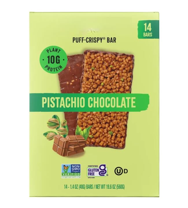 BULK VALUE PACK: Contains 14 individually wrapped 1.4 oz bars. Ideal for stocking up your pantry, office snacks, or on-the-go nutrition for the whole family. CLEAN LABEL DIETARY FRIENDLY: Certified Gluten-Free, Vegan, Non-GMO Project Verified, and Soy-Free. Made with simple, thoughtfully sourced ingredients like quinoa and almond butter. ITALIAN PISTACHIO DARK CHOCOLATE: Indulge in the sophisticated flavor of real Italian pistachios paired with rich, organic dark chocolate for a decadent yet healthy experience. UNIQUE PUFF-CRISPY TEXTURE: Experience a light, airy, and crave-worthy crunch that feels like a crispy treat but functions like a high-performance protein bar. PLANT-BASED PROTEIN: Each bar is packed with 10 grams of high-quality plant protein from pea crisps, making it a perfect post-workout snack or a healthy mid-day pick-me-up.