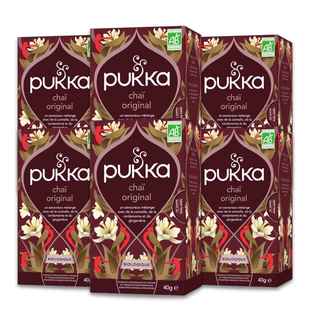 An exotic blend of ginger, cinnamon, cardamom, and Fairtrade black tea, its flavors enhanced by licorice. The magic of India in a cup. At Pukka, our greatest desire is to create a healthier world that fosters well-being through the wonderful properties of organic plants. At Pukka, we create products that promote your well-being, protect nature, and ensure fair compensation for every producer. This is called trade that benefits everyone, fueling positive change for you, for business, and for the planet. We are a B Corp and donate 1 of our revenue to 1 for the Planet. In addition, we are Fair For Life and Fair Wild certified (two certifications for fair trade and the protection of wild plants). If you enjoyed Pukka Chai Original, then you'll surely also love the other products in our "Energy Vitality" range: Revitalize, Three Cinnamon, Wild Apple Cinnamon Ginger, Lemongrass Ginger, Three Licorice, Gorgeous Earl Grey, Vanilla Chai, Licorice Cinnamon, and Elegant English Breakfast. Find the perfect coffee alternative in our range of teas and infusions, or simply choose the right blend to wake you up, invigorate you, and stimulate your senses.All Pukka teas and infusions are Fair For Life certified, guaranteeing fair and positive relationships for all our stakeholders. Pukka respects the planet with 100 recyclable tea and herbal tea tins, ensuring fair and positive relationships between producers and their cooperatives. Pukka is a member of 1 For The Planet, meaning that 1 of our revenue is invested annually in environmental causes. 100 of the ingredients in each Cinnamon, Cardamom Ginger Chai tea bag are organically grown and Fair Trade certified. Bring the wonderful plants in our teas and infusions to life by steeping them for up to fifteen minutes in boiling water. A pack of 6 tins of Pukka Organic Cinnamon, Cardamom Ginger Chai contains 20 tea bags, for a total of 120 tea bags.Un mélange exotique de gingembre, cannelle, cardamome et thé noir issus du commerce équitable et dont les saveurs sont sublimées par la réglisse. La magie de l'Inde dans une tasse. Chez Pukka, notre plus cher désir est de créer un monde plus sain qui serait générateur du bien-être grâce aux vertues merveilleuses des plantes biologiques. Chez Pukka nous créons des produits qui favorisent votre bien-être, préservent la nature et assurent une rémunération équitable pour chaque producteur. Cela s'appelle un commerce profitable à tous, nourrissant un changement positif du monde pour vous, pour le commerce et pour la planète. Nous sommes une société B Corp et nous reversons 1 de notre chiffre d'affaire à 1 Pour La Planète. En plus, nous sommes certifiés Fair For Life et Fair Wild (deux certifications de commerce équitable et de protection des plantes sauvages). Si vous avez apprécié Pukka Chaï Original, alors vous aimerez sûrement aussi les autres produits de notre gamme « Energie et Vitalité » : Revitalise, Trois Cannelles, Pomme Sauvage Canelle et Gingembre, Citronnelle et Gingembre, Trois Réglisses, Gorgeous Earl Grey, Chaï à la Vanille, Réglisse et Cannelle, Elegant English Breakfast. Trouvez la parfaite alternative au café dans notre gamme de thé et d'infusions ou tout simplement, choisissez le bon mélange pour vous réveiller, vous tonifier et stimuler vos sens.Tous les thés et infusions Pukka sont certifiés Fair For Life, ce qui garantit des relations équitables et positives pour tous nos acteurs, notamPukka respecte la planète avec des boîtes de thé et tisane 100 recyclablesment entre les producteurs et leurs coopératives. Pukka est membre du 1 Pour La Planète, cela signifie que 1 de notre chiffre d'affaire est investi chaque année dans des causes environnementales. 100 des ingrédients de chaque sachet de chaï cannelle cardamome et gingembre sont issus de l'agriculture biologique et du commerce équitable. Redonnez vie aux plantes merveilleuses de nos thés et infusions en les faisant infuser jusqu'à quinze minutes dans l'eau bouillante. Lot de 6 boites de chaï bio cannelle cardamome et gingembre de Pukka contient 20 sachets soit 120 sachet au total.Pukka, Chaï Original Bio, Chaï Biologique et Ayurvédique, Relaxant, 100 des Ingrédients Issus du Commerce Equitable, 6x20 Sachets, 120 Sachets