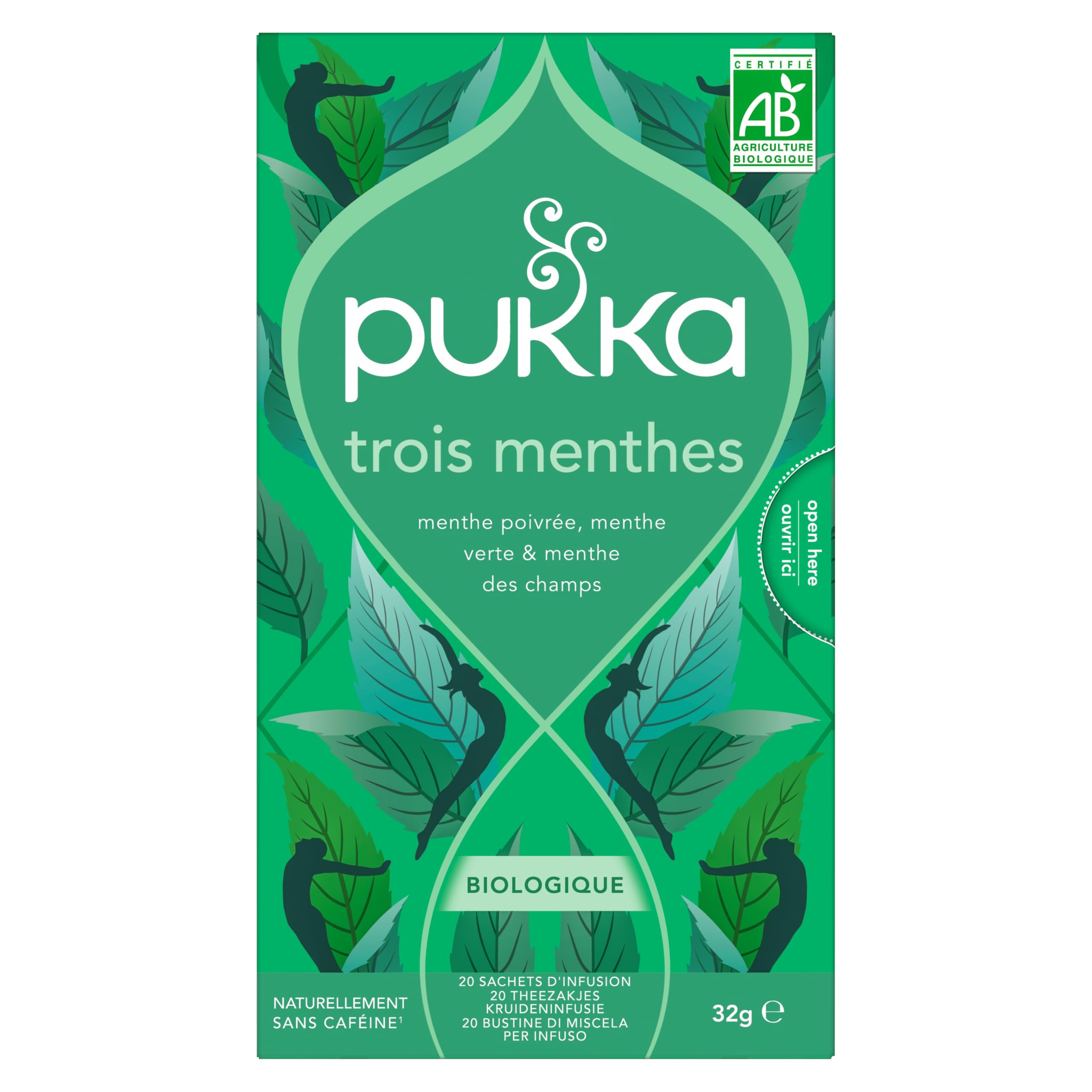 : The perfect after-meal infusion! Dive into a sea of freshness with this blend of peppermint, spearmint, and cornmint. Ingredients: Naturally caffeine-free and made with Fairtrade ingredients. 100 of the ingredients are organically grown: peppermint leaf (45 ), spearmint leaf (39 ), cornmint leaf (16 ). organic. 1Like most herbal teas on the market. P.when('A').execute(function(A) { A.on('a:expander:toggle_description:toggle:collapse', function(data) { window.scroll(0, data.expander. expander[0].offsetTop-100) }) }) Directions: Infuse for 5 to 15 minutes in freshly boiled water. Safety Warning: Drink responsibly. Not suitable for children or pregnant women. Disclaimer: Photograph is for illustrative purposes only. The information above is provided for informational purposes only. It is not necessarily exhaustive and cannot replace the information on the product packaging, which is the only authoritative source and to which you should refer, particularly in case of food intolerance. See moreOrder the Pukka organic three-mint infusion 20 sachets online at the best price and get it delivered to your home in 48 hours.Description du produit L'infusion après le repas ! Plongez dans un océan de fraicheur avec ce mélange de menthe poivrée, menthe verte et menthe des champs Ingrédients Naturellement sans caféine et avec des ingrédients issus du commerce équitable. 100 des ingrédients sont issus de l'agriculture biologique : feuille de menthe poivrée (45 ), feuille de menthe verte (39 ), feuille de menthe des champs (16 ). biologique 1Comme la plupart des infusions du marché. P.when('A').execute(function(A) { A.on('a:expander:toggle_description:toggle:collapse', function(data) { window.scroll(0, data.expander. expander[0].offsetTop-100) }) }) Mode d'emploi Faire infuser 5 à 15 minutes dans de l'eau fraîchement bouillie. Avertissement De Sûreté À consommer avec modération. Ne convient pas aux enfants ou aux femmes enceintes. Clause de non-garantie Photographie non contractuelle. Les indications ci-dessus sont données à titre d'information. Elles ne sont pas forcément exhaustives et ne sauraient se substituer aux informations figurant sur l'emballage du produit qui font seules foi, et auxquelles vous êtes invités à vous reporter, notamment en cas d'intolérance alimentaire. Voir plusCommandez l'article Pukka infusion trois menthes bio 20 sachets en ligne au meilleur prix et faites-vous livrer à domicile en 48h.Pukka infusion trois menthes bio 20 sachets 20 Unité (Lot de 1)