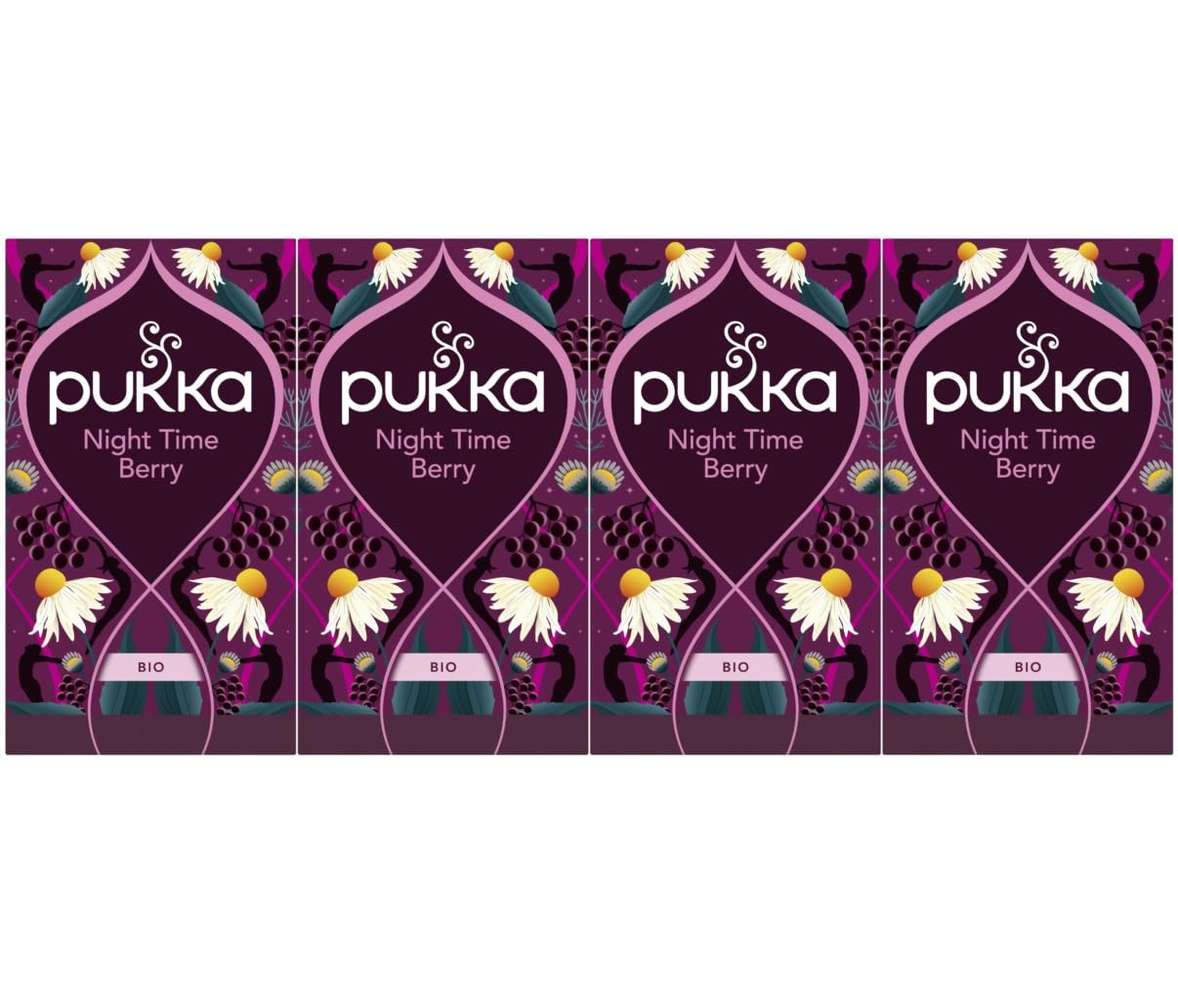 Brief description: The night will be long if you don't rest. How beautiful nature is to offer us linden herbs in this caffeine-free sachet. A dream of herbs composed of gentle oat flower tips, sweet lavender, and silky linden blossom. Let peace return and your sweet dreams begin. www.pukkaherbs.de Preparation: Pour freshly boiled water over the sachet and let it steep for 5 to 15 minutes. Storage and preservation instructions: Store in a dry place, protect from heat. INGREDIENTS Ingredients: Organic ingredients: rosehip, hibiscus flowers, chamomile flowers (15 ), lavender flowers, licorice root, ginger root, echinacea herb (6 ), blackcurrant (4 ), elderberries (4 ), valerian root, blueberry flavor, blackcurrant flavor. 27 FairWild™ certified ingredients (rosehip, licorice) bound to the dry matter. 44 Fairtrade ingredients, Fair for Life Standard certified - rosehip, hibiscus, licorice. DIRECTIONS Pour freshly boiled water over the tea and let it steep for 5 to 15 minutes. SAFETY WARNING Contains licorice, which may cause adverse effects in large quantities. See morePukka Lot de 4 sachets de thé à base de fruits biologiques « Night Time Berry », camomille, lavande, échinacée, baie de sureau, pour un repos paisible du soirDESCRIPTION DU PRODUIT DESCRIPTION DU PRODUIT Brève description : la nuit sera longue si vous ne vous reposez pas. Quelle beauté que la nature nous offre des herbes de tilleul pour ce sachet sans caféine. Un rêve d'herbes composé de pointes douces de fleurs d'avoine, de lavande douce et de fleur de tilleul soyeuse. Laissez la paix revenir et vos doux rêves commencent. www.pukkaherbs.de Préparation Versez de l'eau fraîchement bouillie et laissez infuser pendant 5 à 15 minutes. Conseils de stockage et de conservation : conserver au sec, protéger de la chaleur INGRÉDIENTS Ingrédients : ingrédients biologiques : cynorrhodon, fleurs d'hibiscus, fleurs de camomille (15 ), fleurs de lavande, racine de réglisse, racine de gingembre, herbe d'échinacée (6 ), cassis (4 ), baies de sureau (4 ), racine de valériane, arôme de myrtille, arôme de cassis. 27 d'ingrédients certifiés FairWild™ (cynorrhodon, réglisse) liés à la matière sèche. . 44 des ingrédients issus du commerce équitable, certifiés Fair for Life Standard - cynorrhodon, hibiscus, réglisse. MODE D'EMPLOI Versez de l'eau fraîchement bouillie et laissez infuser pendant 5 à 15 minutes. AVERTISSEMENT DE SÉCURITÉ Contient de la réglisse, ce qui peut entraîner des effets secondaires en grande quantité. Voir plus