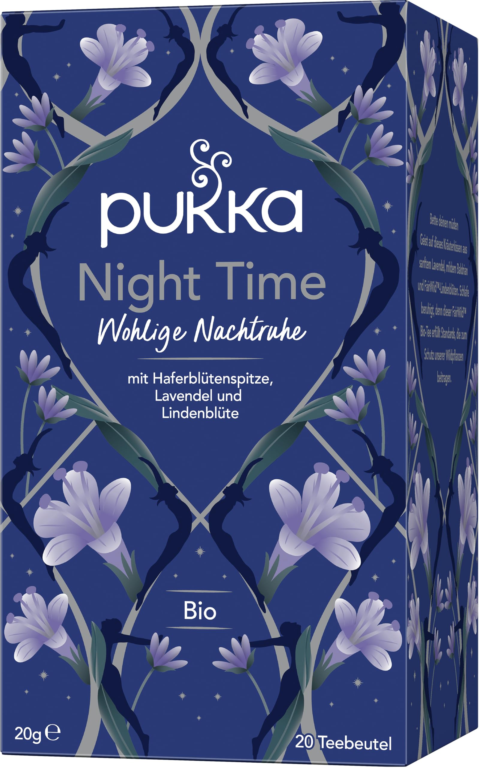 Taste: Storage and Use: Dry Processing: The night will be long if you don't rest. How beautiful nature offers us linden herbs in this caffeine-free sachet. A dream of herbs composed of soft oat flower tips, sweet lavender, and silky linden blossom. Let peace return and your sweet dreams begin. www.pukkaherbs.de Processing additives not used. Certification: Fair for Life, FairWild Soil Association, EU Organic Label INGREDIENTS Oat flower tips 30 , licorice root, chamomile flowers, lavender flowers 14 , linden flowers 10 , valerian root, tulsi leaves, Indian basil