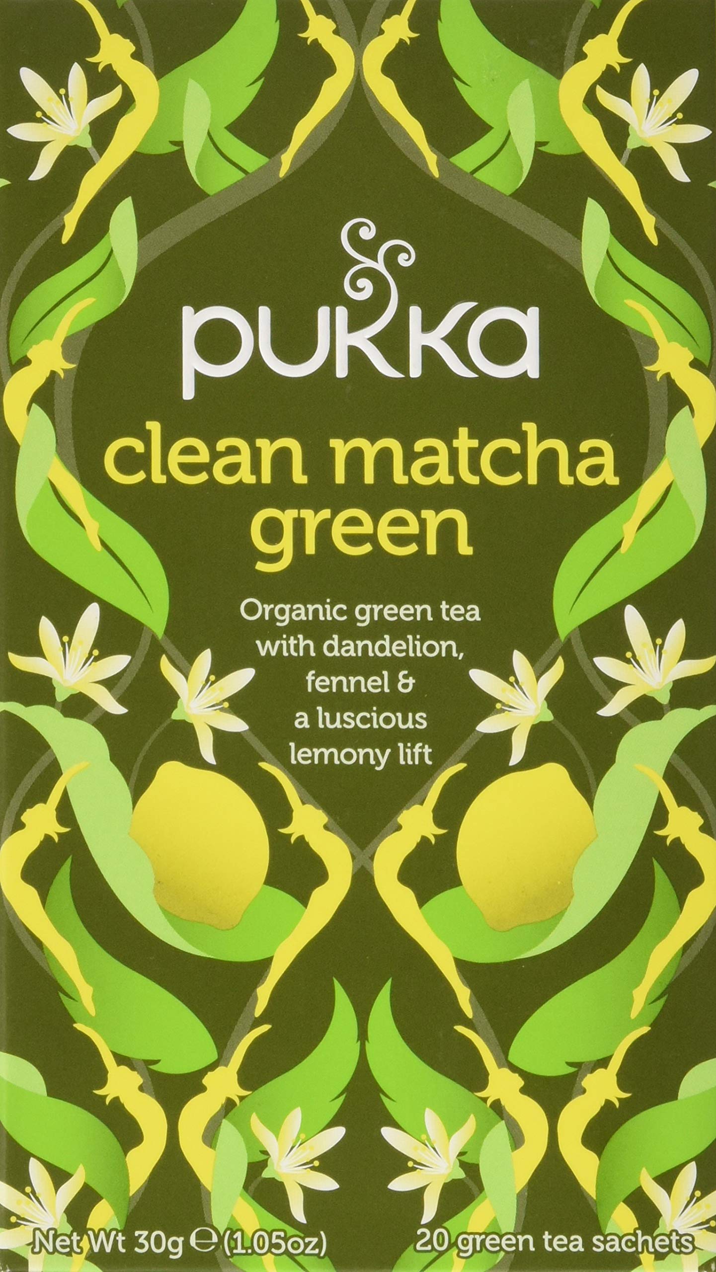 : Pukka Organic Clean Matcha Green Tea combines Sencha green tea with a unique and subtle blend of cleansing herbs and spices: sweet fennel seed, dandelion root, licorice, nettle leaf, turmeric, lemon myrtle leaf, and Matcha green tea powder. Organic Sencha green tea leaves combined with a unique and subtle blend of cleansing herbs and spices: sweet fennel seed, dandelion root, licorice, nettle leaf, turmeric, lemon myrtle leaf. Gluten-free, dairy-free, soy-free, nut-free, Kosher, Fairtrade, FairWild. Ingredients: Sencha green tea leaves (40 ), sweet fennel seeds , dandelion root , licorice , nettle leaves , lemon essential oil flavoring (6 ), turmeric , lemon peel (4 ), lemon myrtle leaves , Matcha green tea powder (Jejo do Garucha) (2 ). Product of organic farming. Contains non-organic lecithin. 46 of the ingredients (green tea, turmeric) are certified Fair Trade. 18 of the ingredients (licorice, nettle leaf) are certified FairWild for sustainable harvesting of natural resources (brochure HERE - PDF, 282kb). P.when('A').execute(function(A) { A.on('a:expander:toggle_description:toggle:collapse', function(data) { window.scroll(0, data.expander. expander[0].offsetTop-100) }) }) Directions: Place one tea bag in a cup, add boiling water, and let it steep for 2 to 5 minutes before drinking. Keep dry. Safety Warning: Consult a healthcare professional before use if you are pregnant or breastfeeding. Not recommended for children. May cause side effects if consumed in large quantities. Keep out of reach of children. See moreBox of 20 sachets. A unique and subtle blend of purifying herbs and spices. Made from exceptional quality, organic and ethically sourced plants.Description du produit Le thé vert Matcha clean biologique Pukka associe un thé vert Sencha avec un mélange unique et subtil de plantes et d'épices dépuratives: graine de fenouil doux, racine de pissenlit, réglisse, feuille d'ortie, curcuma, feuille de myrte citronnée et poudre de thé vert Matcha. Feuilles de thé vert biologique Sencha associées à un mélange unique et subtil de plantes et d'épices dépuratives: graine de fenouil doux, racine de pissenlit, réglisse, feuille d'ortie, curcuma, feuille de myrte citronnée. sans gluten, sans produit laitier, sans soja, sans trace de fruit à coque, Casher, Commerce équitable, FairWild. Ingrédients Feuilles de thé vert Sencha (40 ), graines de fenouil doux , racine de pissenlit , réglisse , feuilles d'ortie , arôme d'huile essentielle de citron (6 ), curcuma , zeste de citron (4 ), feuilles de myrte citronnée , poudre de thé vert Matcha (Jejo do Garucha) (2 ). Produit issu de l'agriculture biologique. contient de la lécithine non biologique. 46 des ingrédients (thé vert, curcuma) certifiés conformes aux standards Fair Trade de commerce équitable. 18 des ingrédients (réglisse, feuille d'ortie) certifiés conformes aux standards FairWild de récolte collecte durable des ressources naturelles (brochure ICI - PDF, 282kb). P.when('A').execute(function(A) { A.on('a:expander:toggle_description:toggle:collapse', function(data) { window.scroll(0, data.expander. expander[0].offsetTop-100) }) }) Mode d'emploi Placez un sachet de thé dans une tasse, ajoutez de l'eau bouillante et laissez infuser pendant 2 à 5 minutes avant de boire. Garder au sec. Avertissement De Sûreté Consultez un professionnel de la santé avant utilisation si vous êtes enceinte ou allaitez. Non recommandé pour les enfants. Peut causer des effets secondaires si consommé en grande quantité. Tenir hors de portée des enfants. Voir plusBoîte de 20 sachets. Mélange unique et subtil de plantes et d'épices dépuratives. Élaborés à partir de plantes de qualité exceptionnelles, biologiques et d'origine éthique.Pukka Thé Vert Bio Matcha Clean 20 Sachets 40 g - Lot de 2