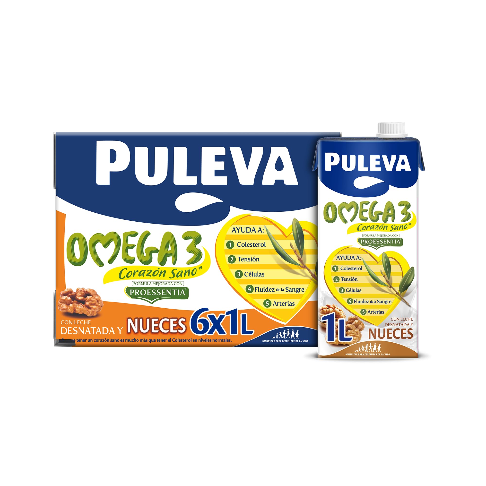 Puleva Omega 3 with walnuts is a dairy product made from skimmed milk enriched with oleic acid from olive oil, omega-3 fatty acids (EPA and DHA), natural plant extracts of green tea and grape, vitamins, and minerals. Puleva Omega 3 with walnuts also contains this natural ingredient, characteristic of our Mediterranean diet, which, in addition to offering numerous benefits thanks to its high oleic acid content, gives it the natural taste of the finest walnuts. INGREDIENTS Skimmed milk (90 ), vegetable oils (high oleic sunflower and olive), sugar, emulsifiers (soy lecithin and citrus esters of monoglycerides and diglycerides), stabilizers (pentasodium triphosphate, potassium citrate, E-460 and E-466), blue fish oil, color (E-150c), nut powder (0.05 nuts), tricalcium phosphate, flavoring, and vitamins (A, B6, folic acid, C, D, and E) INSTRUCTIONS Once opened, keep refrigerated and consume within two to three days. SAFETY WARNING Keep refrigerated. May contain allergens. See morePuleva Omega 3 avec écrous. Pack de 6 x 1 l NoixDESCRIPTION DU PRODUIT DESCRIPTION DU PRODUIT Puleva Omega 3 aux noix est un produit laitier fabriqué à partir de lait écrémé auquel on a incorporé de l'acide oléique issu de l'huile d'olive, des acides gras oméga-3 (EPA et DHA), des extraits végétaux naturels de thé vert et de raisin, des vitamines et des minéraux. Puleva Omega 3 avec proessentia noix, possède également cet ingrédient naturel propre à notre régime méditerranéen qui, en plus d'offrir de multiples avantages grâce à sa haute teneur en acide oléium, lui apporte le goût naturel des meilleures noix. INGRÉDIENTS Lait écrémé (90 ), huiles végétales (tournesol haut oléique et olive), sucre, émulsifiants (lécithine de soja et esters d'agrumes de monoglycérides et diglycérides), stabilisants (triphosphate pentasodique, citrate de potassium, E-460 et E-466), huile de poisson bleu, colorant (E-150 c), préparation d neuf z en poudre (0,05 de noix), phosphate tricalcique, arôme et vitamines (A, B6, acide folique, C, D et E) MODE D'EMPLOI Après ouverture, conserver au froid et consommer dans les deux à trois jours. AVERTISSEMENT DE SÉCURITÉ Conserver au réfrigérateur. Peut contenir des allergènes. Voir plus