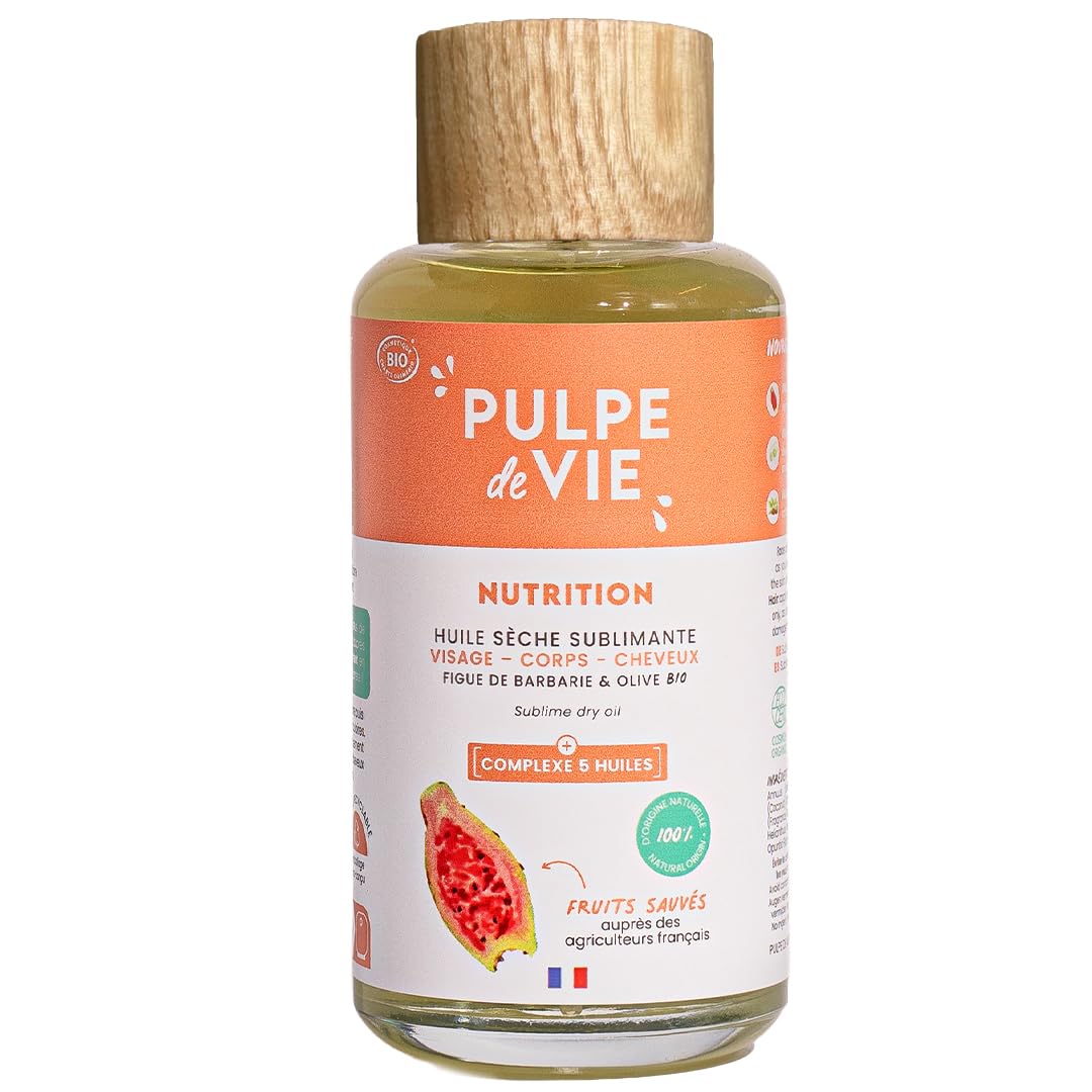 ECOLOGIQUE : Pulpe de Vie lutte contre le gaspillage en créant des soins aux fruits anti-gaspi. Nous utilisons des fruits déclassés (issus des invendus alimentaire), pour vous offrir des produits bon pour tous. Pulpe de Vie s'engage pour votre bien-être et la planète !. MODE D'EMPLOI : Vaporisez sur la peau, les cheveux, ou les zones à chouchouter. Massez en douceur, la texture non-collante pénètre rapidement. COMPOSITION SIMPLE ET EFFICACE : Faite de 4 huiles végétales adoucissantes et d'extrait de Figue de Barbarie, cette huile est un véritable trésor pour la peau. NUTRITION MULTIFONCTION : Cette huile sèche 100 naturelle nourrit la peau, nourrit les cheveux, et peut même servir pour le démaquillage ou après l'épilation.