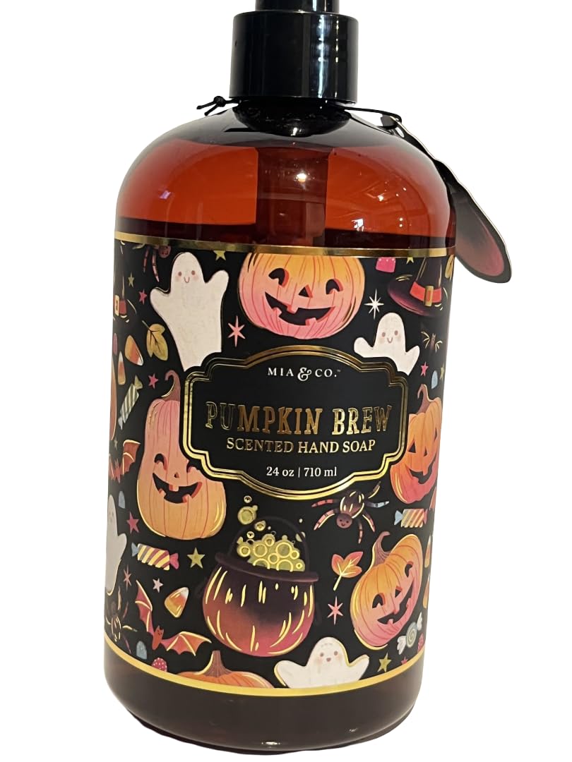 SEASONAL COLLECTION: Part of the Pumpkin Brew scented hand soap line, perfect for fall and Halloween celebrations. PUMP DISPENSER: Convenient pump-top mechanism for easy, controlled dispensing of liquid hand soap. DECORATIVE PACKAGING: Amber-colored bottle with premium label design makes an attractive addition to Halloween bathroom or kitchen decor. GENEROUS SIZE: 24 fluid ounce pump bottle provides ample supply for extended use during the holiday season. FESTIVE DESIGN: Halloween-themed hand soap featuring playful jack-o'-lanterns, ghosts, and autumn motifs on a black background with elegant gold accents.
