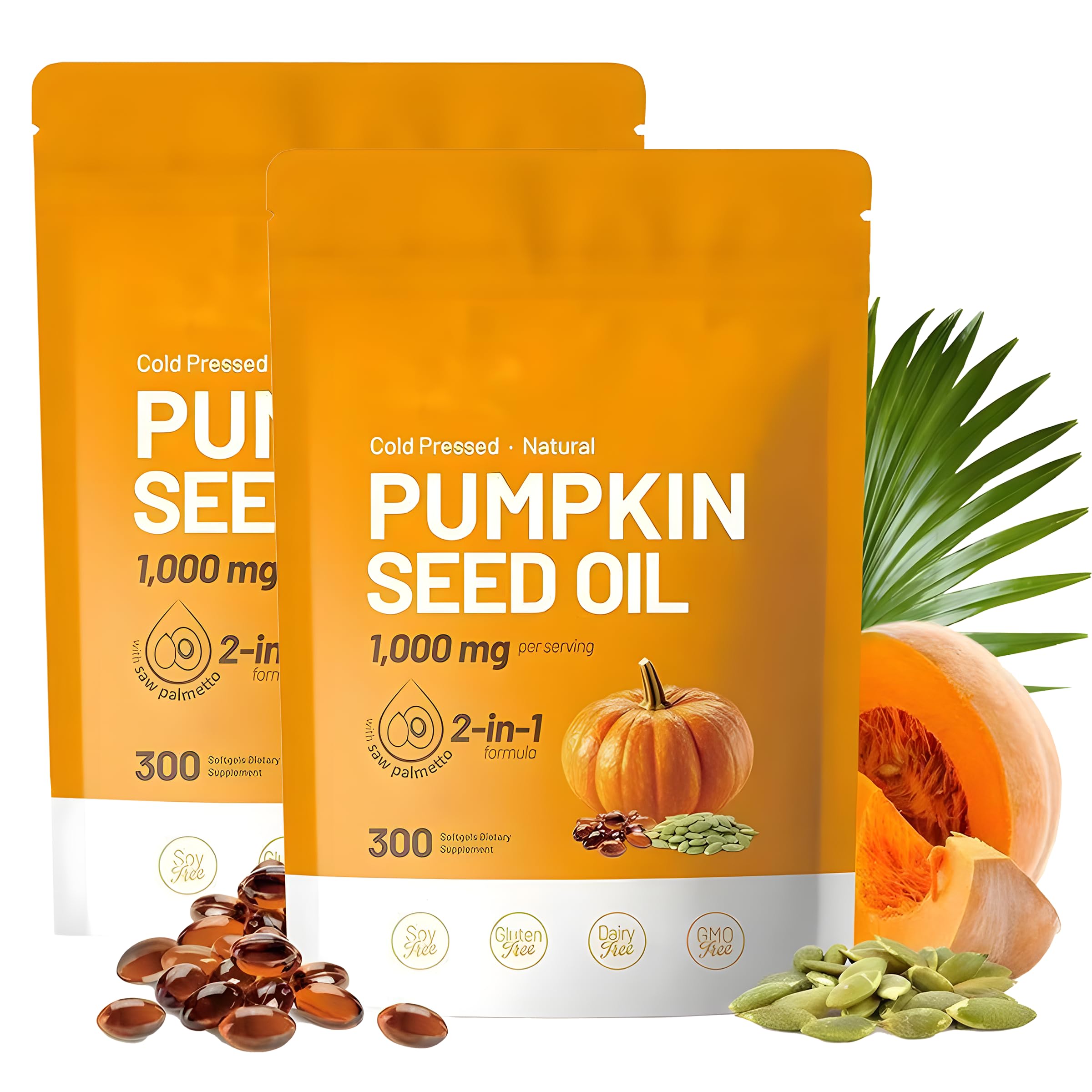5. CLEAN NON-GMO INGREDIENTS:Made with non-GMO, non-irradiated pumpkin seed oil. Free from soy, dairy, gluten, preservatives, artificial flavors, and tree nuts. Produced under strict quality control standards. 4. COLD PRESSED FOR NUTRIENT PRESERVATION:Cold pressed pumpkin seed oil is extracted without heat to retain essential fatty acids, phytosterols, omega-6 and omega-9, along with naturally occurring antioxidants. 3. PROSTATE URINARY SUPPORT:Pumpkin seed oil combined with saw palmetto is commonly used to help support prostate function, bladder comfort, and urinary tract wellness, suitable for both men and women. 2. HIGH POTENCY LONG SUPPLY:Each pouch contains 300 softgels. A 3-softgel serving provides 3000mg pumpkin seed oil plus 300mg saw palmetto 4:1 extract, supporting a full 100-day supply. 1. MAX STRENGTH 2-IN-1 FORMULA:Each serving blends cold pressed pumpkin seed oil capsules with saw palmetto extract to deliver a balanced, high-potency softgel designed for daily wellness and long-term support.