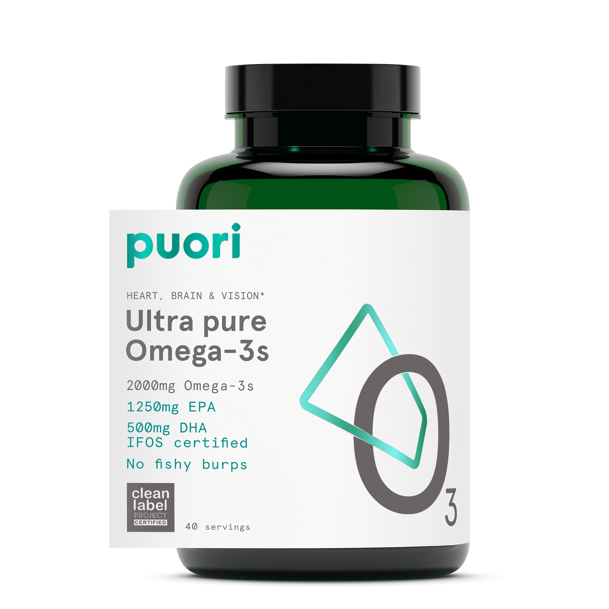 Full Transparency: We strive to make the cleanest products. Every batch of every product is reviewed for purity and potency by The Clean Label Project. They use independent laboratories to test against 200 contaminants and publish the results on their website using the respective batch number. How to Use: For adults 11 years and up, take 3 soft gels daily, preferably with a meal or as recommended by a physician. You can choose to take your daily dose all at once or divided throughout the day. Ingredients Story: Our O3 formula is made up of fresh fish oil from wild caught anchovies from the South-Pacific Ocean. It also includes lemon oil from real lemons to help give O3 a fresh smell and taste. Vitamin E is added to the fish oil to make sure it stays fresh. Benefits: Omega-3 and omega-6 are both essential fatty acids that must come from the diet. In the typical Western diet, omega-6 intake is often much higher, while most of the population don't consume enough omega-3s. Increg omega-3 intake helps maintain a balance between the two, as well as playing a role in maintaining healthy heart, brain, and vision function. . Why We Made O3: Puori's O3 Fish Oil supplement was developed to provide fresh, clean fish oil that won't give you fishy burps or aftertaste. Each serving delivers 2000mg of Omega-3s, including 1250mg EPA and 500mg DHA, to support heart, brain, and eye health. 120 softgels.