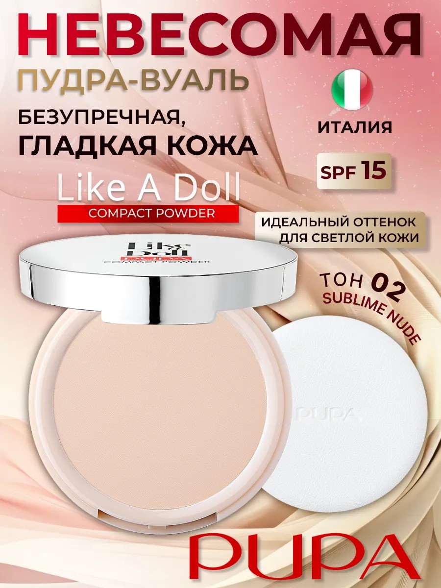Шелковая компактная пудра LIKE A DOLL COMPACT POWDER 02 от Pupa - это неосязаемый порошок, который гарантирует создание матового сияющего эффекта. Кожа приобретает удивительно гладкий и ровный вид. Изысканно лёгкая, как пух, фиксирующая текстура сливается с кожей и обеспечивает прозрачный эффект обнажённой кожи. Обладает матирующим и закрепляющим действием. Макияж, который есть сейчас, останется навсегда! Закрепляющая стойкая формула этой пудры позволяет удерживать макияж на целый день, обеспечивая идеальное покрытие фотошоп и защиту кожи. Моделируемая степень покрытия и фиксатор макияжа: от легкой до средней плотной. Эксклюзивная формула содержит силиконовые полимеры шариковой формы, обладают выравнивающими и разглаживающими свойствами, частицы пористого кварца абсорбируют секрет сальных желёз и оказывают матирующий эффект "антиблеск", микрочастицы силиконовой смолы для придания коже одновременно матового и сияющего эффекта, пигменты, обработанные силиконом, и рисовый крахмал, который обеспечивает стойкий эффект и идеальное нанесение. Естественный светлый бежевый цвет этой пудры соответствует тону кожи, а золотисто-бежевый оттенок добавляет небольшой цвет легкого загара на вашу кожу. Белые частички в составе пудры позволяют создать натуральный светящийся эффект на коже. Она гипоаллергенна и не вызывает раздражения чувствительной кожи, благодаря натуральным ингредиентам, которые содержатся в этом продукте. Компактная пудра поставляется с зеркалом внутри, что делает ее удобной для применения в любом месте. Вв пудра содержит Уф защиту СПФ от ультрафиолетовых лучей, что защищает кожу от солнечных ожогов и преждевременного старения кожи. Пудра для лица матирующая матирует кожу, убирая жирный блеск и придает ей естественное матовое покрытие, помогает скрыть расширенные поры на коже, обладает антибактериальным эффектом - предотвращает появление воспалительных элементов на коже, угрей и прыщей.