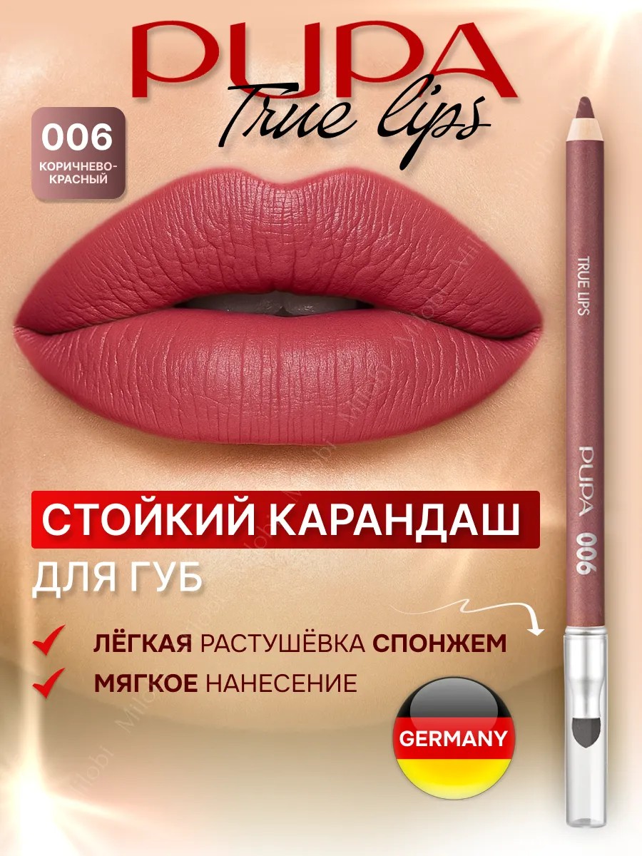 Водостойкий карандаш для губ True Lips 06 итальянской марки PUPA обладает мягкой сливочной консистенцией и высокой степенью пигментации. Им удобно не только прорисовывать контур, но и использовать в качествы основы под кремовую помаду для повышения ее стойкости и от растекания за контур губ или вовсе использовать как матовую помаду. Для растушевки на противоположном конце стержня предусмотрен латексный гипоалергенный аппликатор. С его помощью можно создать эффект объемных губ омбре. Для этого обведите контур губ и растушуйте аппликатором к центру, поверх нанесите помаду или блеск на тон светлее. Визажисты используют карандаш Тру Липс в качестве универсального профессионального средства, используя коричневую палитру оттенков в качестве карандаша для бровей.