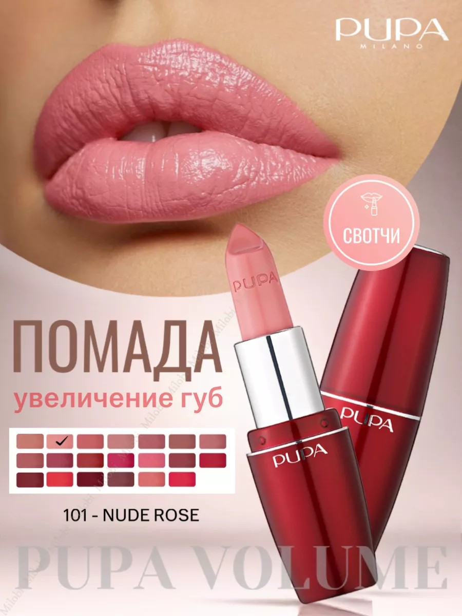 Увлажняющая помада для увеличения объёма губ быстрого действия от Пупа - это средство, которое обеспечивает удивительный макияж, блеск и эффективный уход бальзама с приданием объёма губам. Мгновенный результат: эффект пухлых губ, насыщенный цвет, чёткие и яркие губы. После 7 дней применения губы выглядят более объёмными и увлажнёнными. Помада для объема Volume - это кремообразная приятная текстура гарантирует ровный цвет и необыкновенную яркость. Формула с эффектом увеличения содержит Volufiline, натуральный биоэкстракт азиатской гардении, который способствует приданию объёма кожным тканям и разглаживает мелкие морщины. Гиалуроновая кислота удерживает влагу, увеличивает тургор и объём губ. Не соглашайтесь на простую помаду! Для четкого выделения сначала обведите губы карандашом True Lips 004. Помада для губ увлажняющая. Тон: 100, 101, 102, 104, 105, 200, 300, 301, 401, 500, 600. Холодным блондинкам подойдут естественные прохладные розовые, лиловые, а также нежно-сиреневый и оттенки нюд естественного цвета. Теплым блондинкам подойдут коралловые, ягодные и персиковые расцветки. Холодным брюнеткам подойдут бордовые, винные, алый и красные тона. Теплым брюнеткам подойдет практически вся палитра теплых отливов: персиковый, коричневый. Рыжим девушкам лучше остальных подходят коричневые, вишневые, карамельные, нюдовые, терракотовые, морковные и розовые отливы. Русым идеально подойдут коричневые, персиковые, алые, терракотовые оттенки. Как подростки, так и взрослые женщины найдут себе оттенки по душе. В отличии от помады для увеличения губ с перцем помада Pupa Volume не травмирует губы и не вызывает дискомфорта.