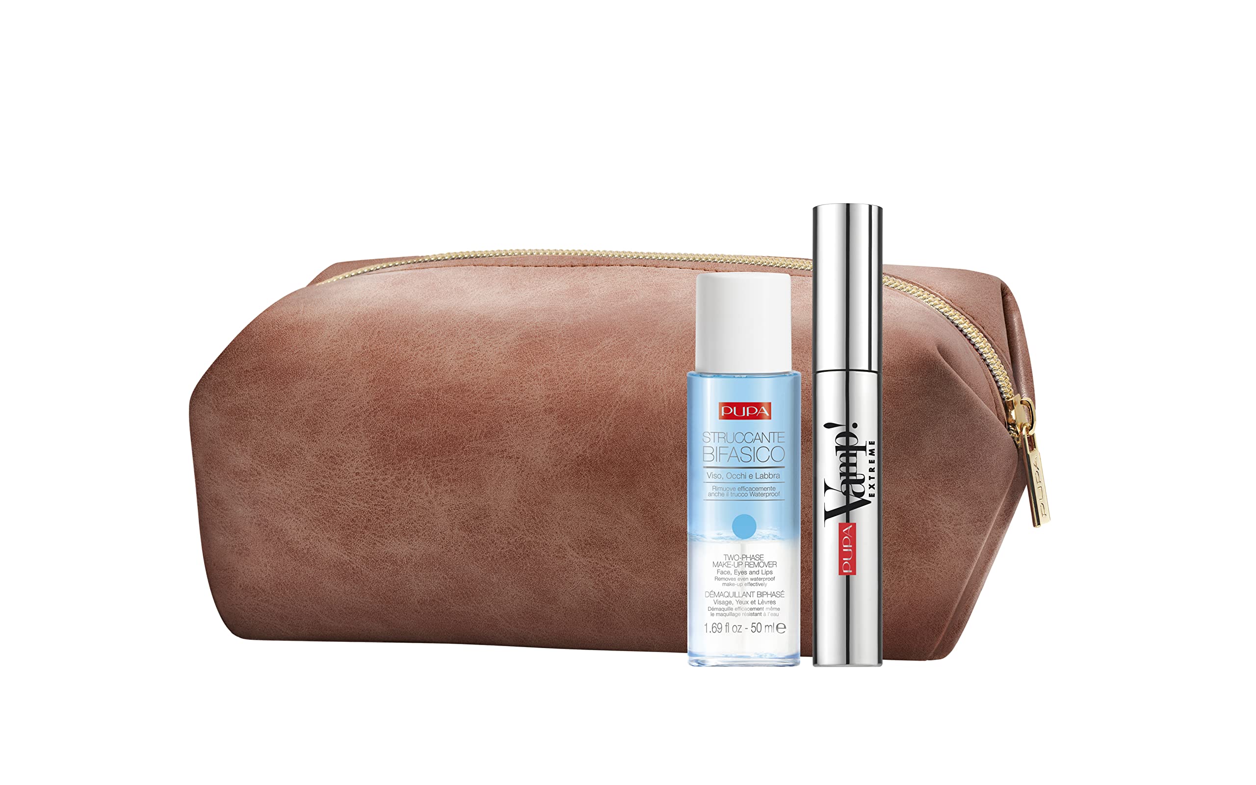 Pupa Milano Vamp! All in One and Two-Phase Make-Up Remover Set For Women 3 Pc 0.30oz Vamp! All in One Mascara - 101 Black, 1.69oz Two-Phase Make-Up Remover, Beauty Bag