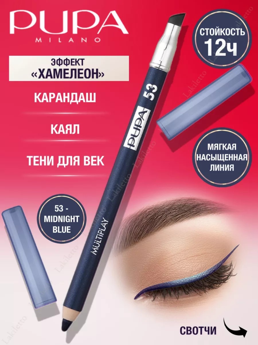 Карандаш для глаз с аппликатором Multiplay Eye Pencil 3в1 ПОДВОДКА, ТЕНИ для век и КАЙАЛ Пупа вамп. Стойкий карандаш для глаз с аппликатором для растушёвки предназначен для создания стрелок, подводки внутреннего века, может выполнять основу для теней или заменить тени для глаз. Карандаш гипоаллергенный, подходит для чувствительных глаз и контактных линз. Благодаря уникальной формуле, обогащенной восками и маслами, карандаш легко наносится, скользит по коже век, не царапает и не растягивает веко. Карандаш для глаз с блестками лучше наносить поверх стойких кремовых теней с матовой или сатиновой текстурой. Советы по макияжу: для создания четкой, тонкой и острой стрелки используйте жидкую подводку для глаз или лайнер, можно использовать фломастер для глаз. Подводка со штампом обычно используется для супер быстрого макияжа. Гелевую подводку можно нанести на все веко, в качестве базы для теней. Мягкие кайалы подойдут для прорисовки слизистого контура век и межреснички. Их же можно использовать для дымчатых стрелок и в качестве подложки при создании макияжа смоки. Карандаш легко точится точилкой 004 . Тон 08 02 09 22 12 14 56 04 05 17 13 59 03 62 01 15 19 74 58 53 57 004