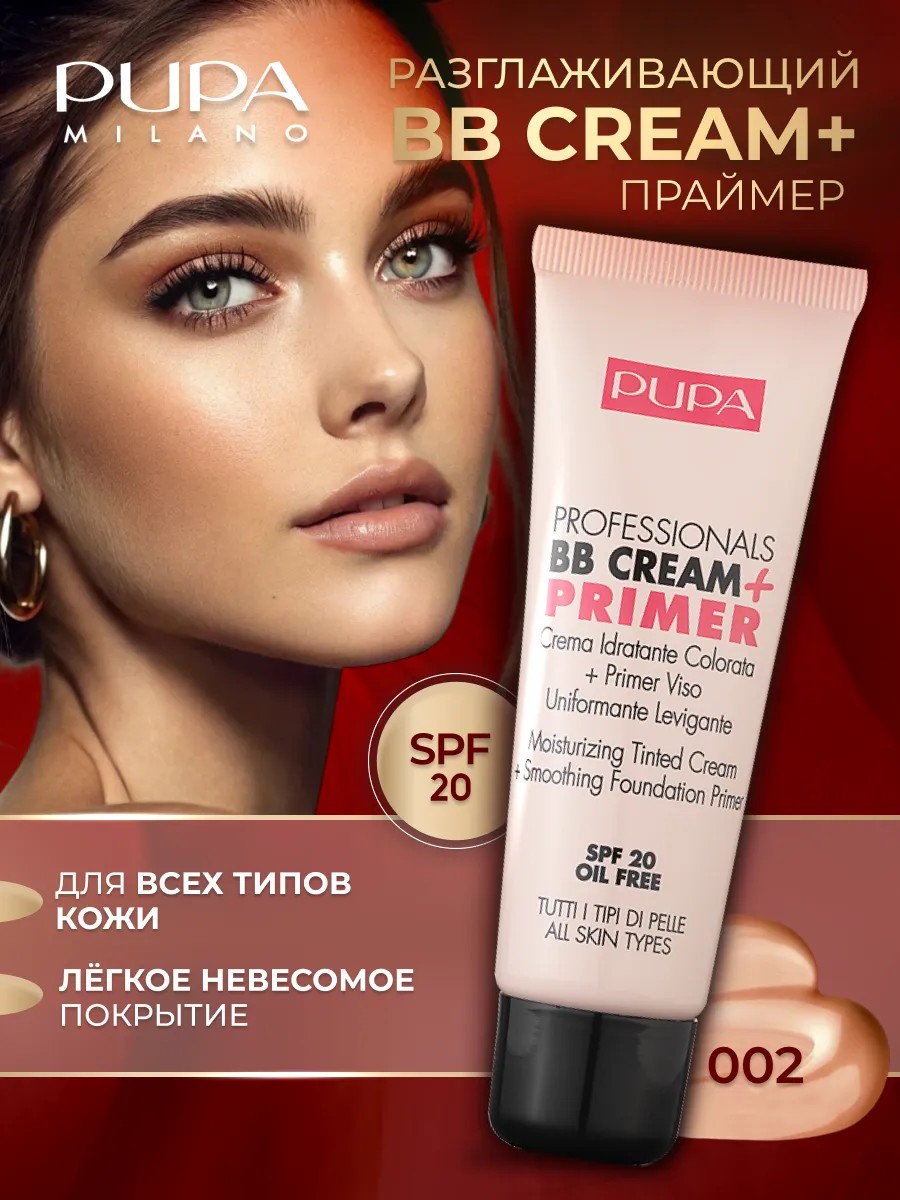 Pupa Professionals BB+Primer SPF 20 BB Cream for All Skin Types is a multifunctional, smart BB cream. It's a moisturizing foundation + makeup primer with a smoothing and hydrating effect. This BB cream hydrates and smoothes skin, evens out complexion, reduces imperfections, and protects from UV rays. All in one go. Designed for those short on time but who don't want to give up perfect, long-lasting makeup. Make your life easier! Latest-generation silicone polymers create a barrier between skin and makeup, providing dual action: smoothing and fixing. Beeswax, with its softening and restorative properties, moisturizes the skin. Hyaluronic acid regulates the water balance in tissues and combats dryness. Evodia extract reduces the negative effects of free radicals. SPF 20 helps protect against sun damage.
