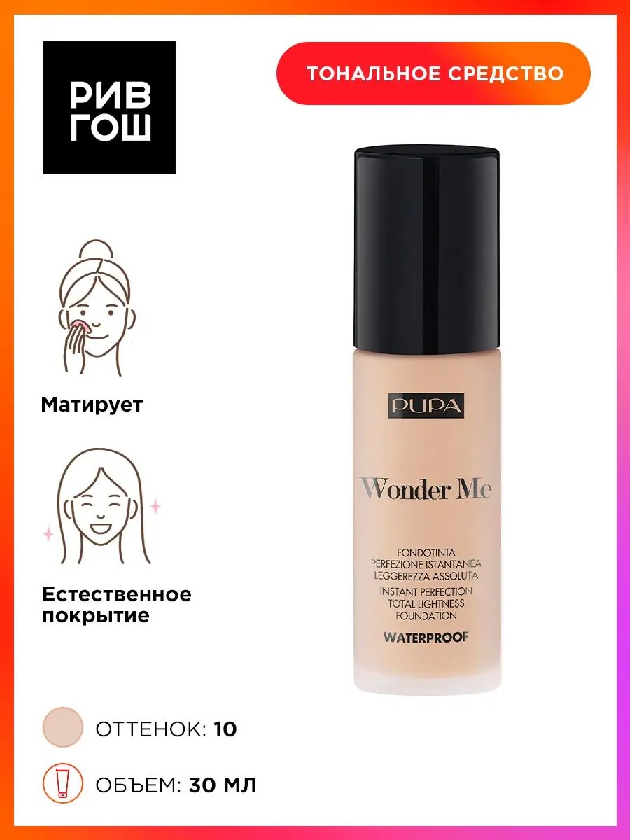 Совершенный цвет лица без эффекта маски и стянутости. Водостойкое покрытие, максирует несовершенства, выравнивает тон и дарит ощущение комфорта. Подходит для любого типа кожи, без масел и спирта, некомедогенен. Нанести на кожу лица с помощью спонжа, кисти или пальцев. Тональная основа Wonder Me, 30 мл, 010. У нас Вы всегда сможете подобрать женскую и мужскую парфюмерию, декоративную косметику, а так же уходовые средства для волос, тела и лица. РИВ ГОШ вдохновляет дарить подарки каждый день. Одним из ключевых шагов в уходе за кожей лица является использование качественного тонального крема. Тональный крем для лица это не только способ придать коже идеально ровный тон, но и обеспечить ей грамотный уход. Наш тональный крем идеальное решение для женщин, которые ценят красоту и здоровье своей кожи. Благодаря уникальной формуле, он не только маскирует недостатки, но и ухаживает за кожей, делая ее более упругой, гладкой и сияющей. Текстура крема позволяет коже дышать. Будьте уверены, что наш косметический продукт поможет вам выглядеть безупречно в любой ситуации.