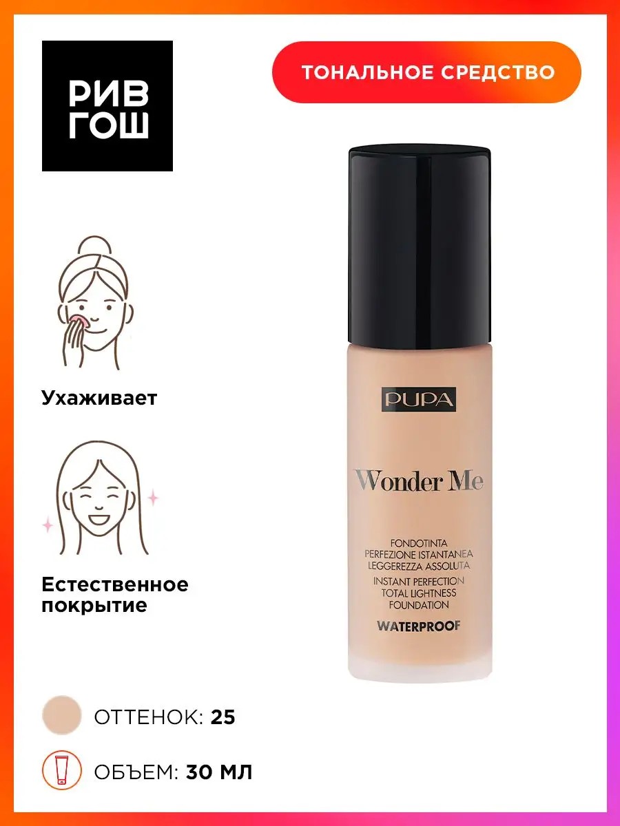 Совершенный цвет лица без эффекта маски и стянутости. Водостойкое покрытие, максирует несовершенства, выравнивает тон и дарит ощущение комфорта. Подходит для любого типа кожи, без масел и спирта, некомедогенен. Нанести на кожу лица с помощью спонжа, кисти или пальцев. Тональное средство для лица PUPA .У нас Вы всегда сможете подобрать женскую и мужскую парфюмерию, декоративную косметику, а так же уходовые средства для волос, тела и лица. РИВ ГОШ вдохновляет дарить подарки каждый день. Одним из ключевых шагов в уходе за кожей лица является использование качественного тонального крема. Тональный крем для лица это не только способ придать коже идеально ровный тон, но и обеспечить ей грамотный уход. Наш тональный крем идеальное решение для женщин, которые ценят красоту и здоровье своей кожи. Благодаря уникальной формуле, он не только маскирует недостатки, но и ухаживает за кожей, делая ее более упругой, гладкой и сияющей. Текстура крема позволяет коже дышать. Будьте уверены, что наш косметический продукт поможет вам выглядеть безупречно в любой ситуации.