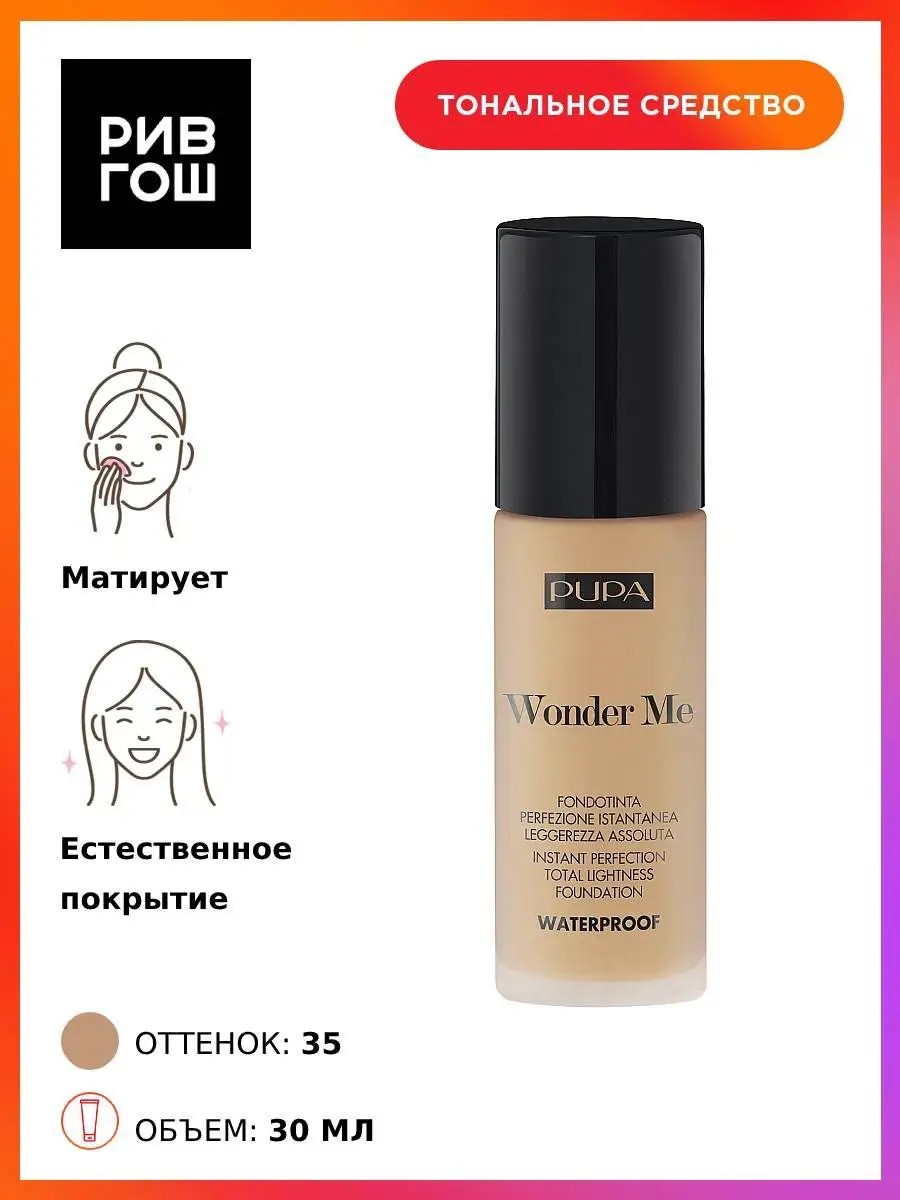 Совершенный цвет лица без эффекта маски и стянутости. Водостойкое покрытие, максирует несовершенства, выравнивает тон и дарит ощущение комфорта. Подходит для любого типа кожи, без масел и спирта, некомедогенен. Нанести на кожу лица с помощью спонжа, кисти или пальцев. Тональное средство для лица PUPA WONDER ME. У нас Вы всегда сможете подобрать женскую и мужскую парфюмерию, декоративную косметику, а так же уходовые средства для волос, тела и лица. РИВ ГОШ вдохновляет дарить подарки каждый день. Одним из ключевых шагов в уходе за кожей лица является использование качественного тонального крема. Тональный крем для лица это не только способ придать коже идеально ровный тон, но и обеспечить ей грамотный уход. Наш тональный крем идеальное решение для женщин, которые ценят красоту и здоровье своей кожи. Благодаря уникальной формуле, он не только маскирует недостатки, но и ухаживает за кожей, делая ее более упругой, гладкой и сияющей. Текстура крема позволяет коже дышать. Будьте уверены, что наш косметический продукт поможет вам выглядеть безупречно в любой ситуации.