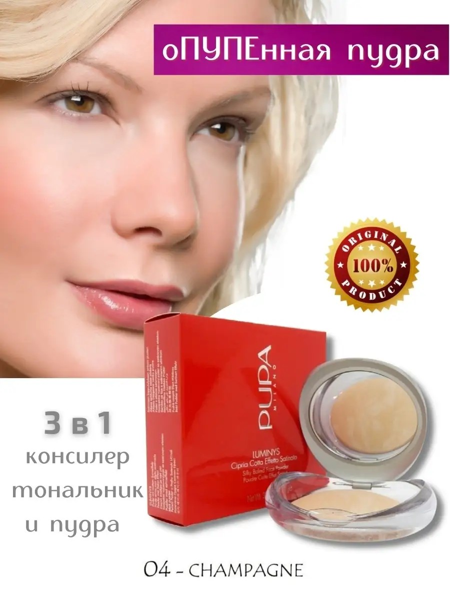 PUPA Пудра компактная запеченная Luminys Baked Face Powder 04 Champagne, тон 04 шампань. Эта фиксирующая пудра для лица может стать идеальным вариантом для тех, кто не любит тональные основы. Полная замена тональному крему - пудра-фотошоп от Pupa: эффект ухоженной и гладкой кожи с деликатным свечением. Благодаря уникальной технологии запекания, пудра обладает мягкой текстурой, легко распределяется по лицу. Скрывает несовершенства, поры и недостатки, контролирует жирный блеск.Это настоящая находка для жирной и комбинированной кожи! Закрепляет макияж, выравнивает, матирует, придавая коже сатиновое сияние и Blur эффект. Входящее в состав масло жожоба оказывает увлажняющее действие, обеспечивает правильный уход и защиту. Только естественная красота без эффекта маски! Подходит для нормальной, жирной, сухой и комбинированной кожи. Используйте светлую палитру 01 и 04 тона, как хайлайтер и основу под тени. А золотистые цвета 05 и 06 тона -как бронзирующее средство и румяна. В коллекции: 01 тон - арт. 38765772, 04 тон - арт. 38765775; 05 тон - арт. 38765774 , 06 тон- арт. 38765776